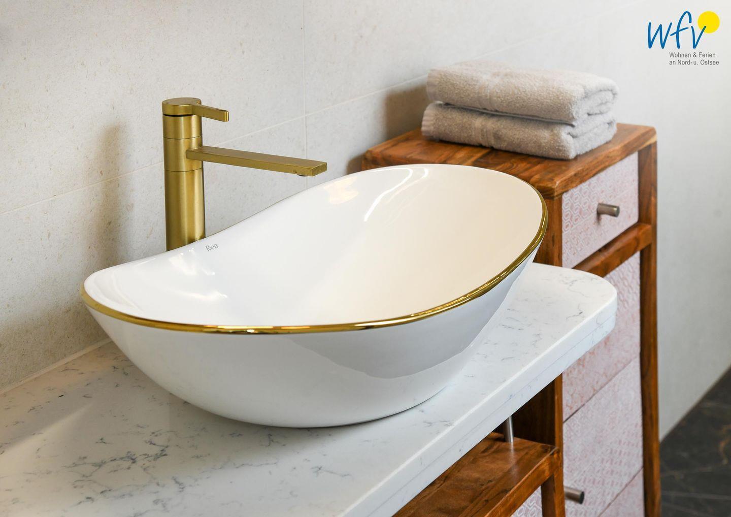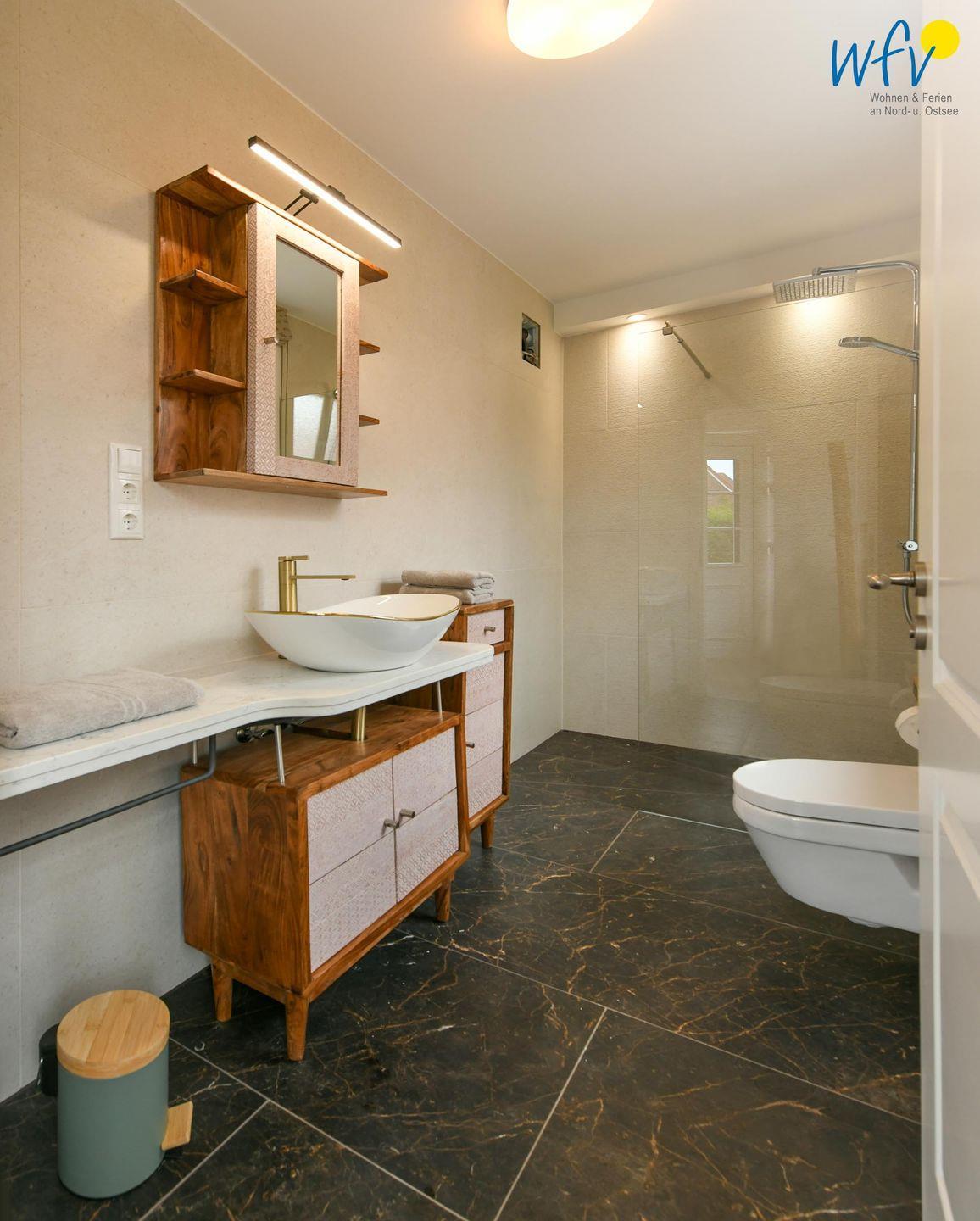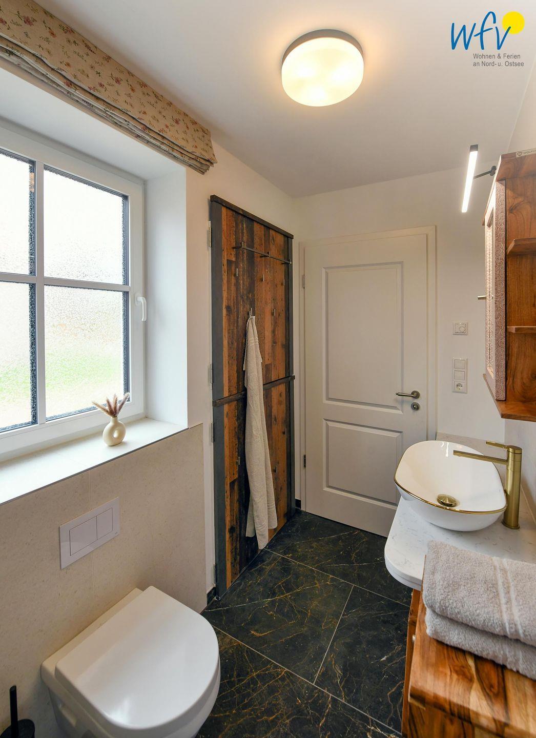 Das elegante Tageslichtbad mit Dusche sorgt für wohltuende Entspannungszeit. Zusätzlich ist ein Gäste-WC vorhanden.