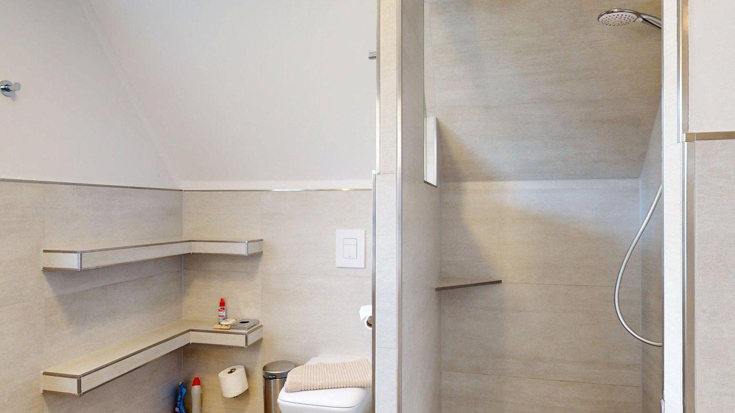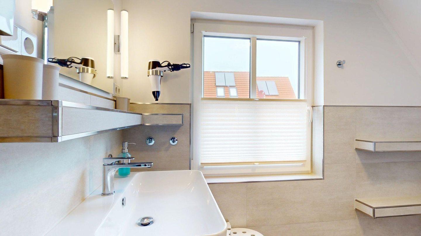 Das Tageslichtbad, mit Fußbodenerwärmung bietet eine begehbare Dusche sowie Waschtisch mit großem Spiegel und WC. Die Galerie überrascht Sie mit einem tollen Ausblick über die Dächer von Langeoog.