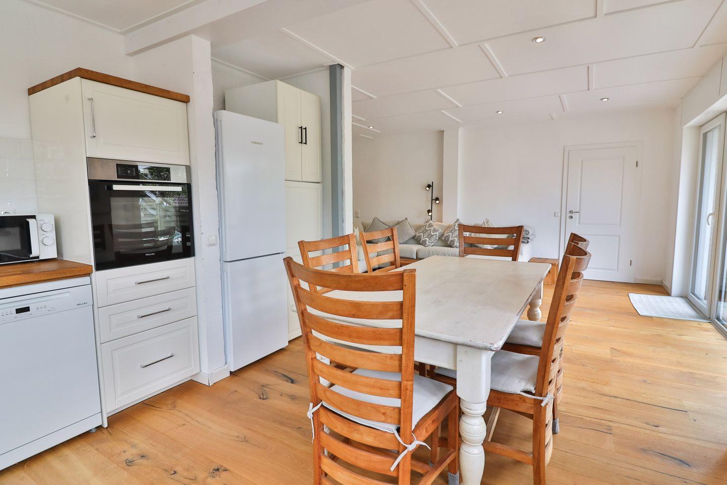 Der großzügige Wohnbereich ist das Herzstück der Wohnung: Ein großes, gemütliches Sofa lädt zum Entspannen ein, während ein Fernseher und Gesellschaftsspiele für Unterhaltung sorgen. Die Wohnung verfügt über WLAN, sodass Sie immer gut vernetzt sind. Direkt angrenzend an den Wohnbereich befindet sich die offene Küche im Landhausstil mit einem großen Essbereich. Die Küche ist voll ausgestattet und lässt keine Wünsche offen – mit Ceranfeld, Backofen auf angenehmer Arbeitshöhe, Mikrowelle, Spülmaschine, Kühl- und Gefrierschrank, Kaffeemaschine, Senseo-Padmaschine, Toaster, Wasserkocher und vielen weiteren nützlichen Küchenutensilien.