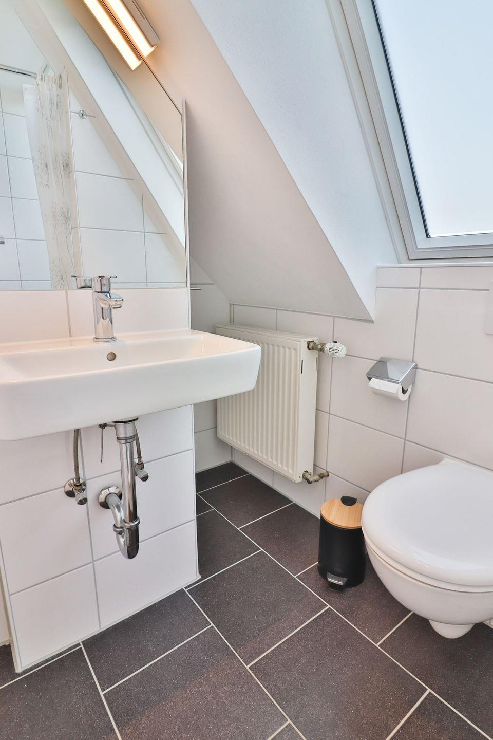 Das Schlafzimmer ist mit einem gemütlichen Doppelbett (180x200 cm), einem Kleiderschrank und Verdunkelungsvorhängen ausgestattet – für erholsame Nächte nach langen Inselspaziergängen. Das Badezimmer verfügt über Dusche, WC und Waschbecken.