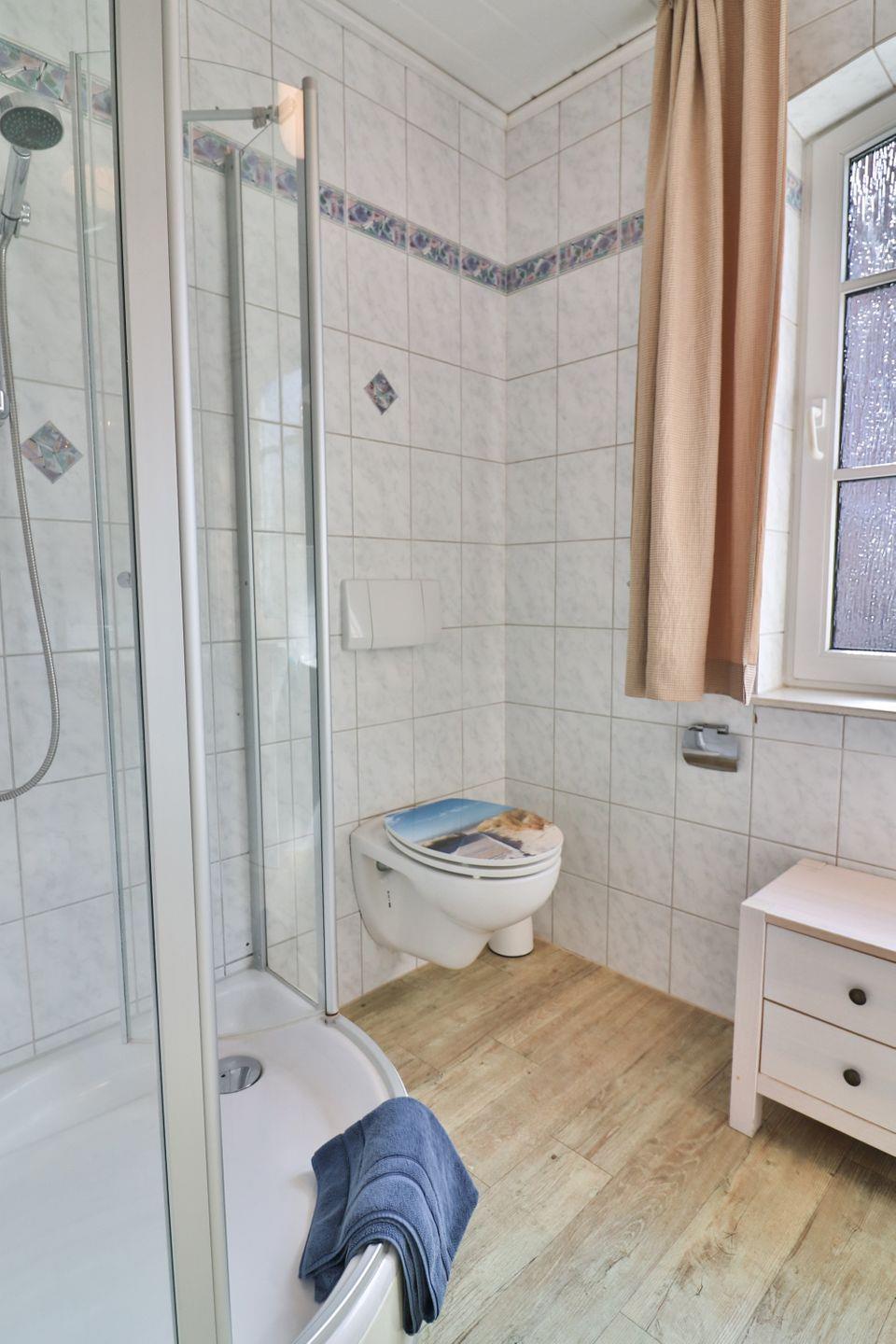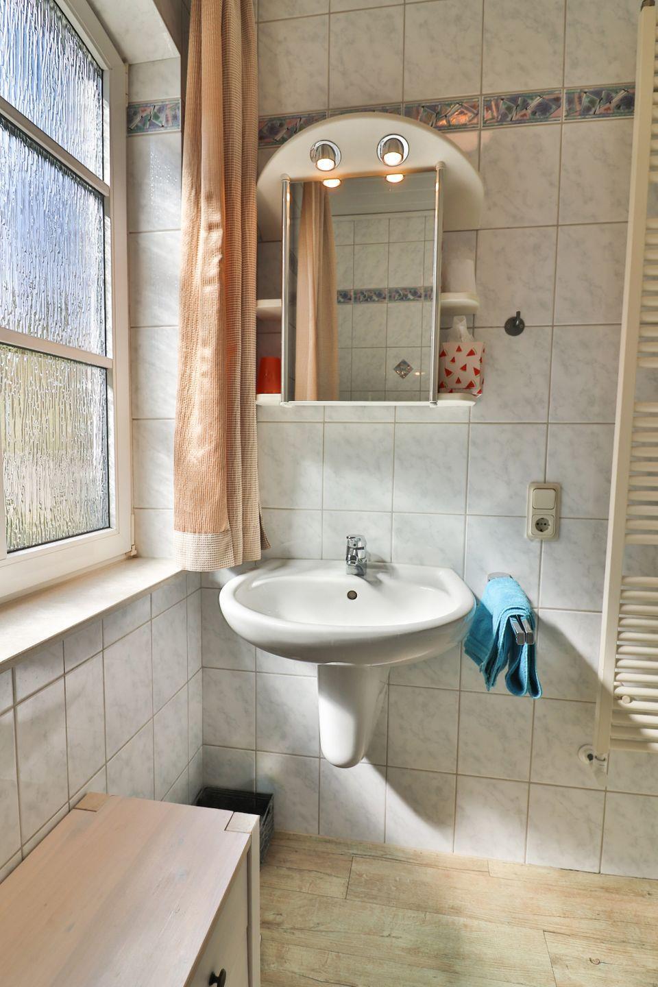 Das Tageslicht-Badezimmer ist mit einer Dusche, Waschbecken, WC und Haartrockner ausgestattet.