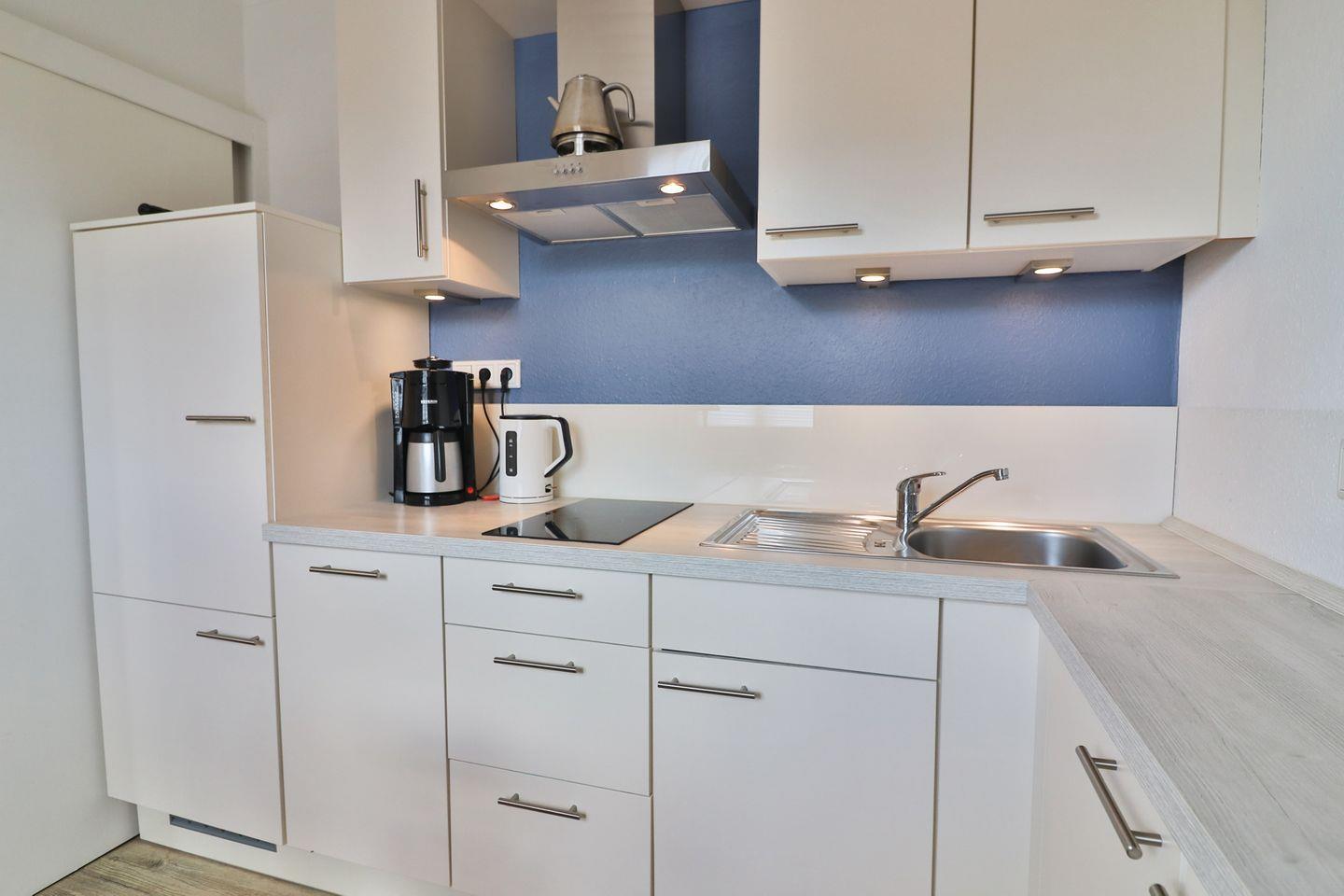 Im geschlossenen Küchenbereich mit Esstisch steht Ihnen eine voll ausgestattete Küche zur Verfügung. Hier finden Sie unter anderem einen Geschirrspüler, eine Mikrowelle, einen 2-Platten-Ceran-Herd, Kaffeemaschine, Wasserkocher, Toaster, Kühlschrank, Mixer, Eierkocher sowie alle notwendigen Küchenutensilien, Geschirr und Besteck. Auch ohne Backofen können Sie hier Ihre Lieblingsmahlzeiten zubereiten.