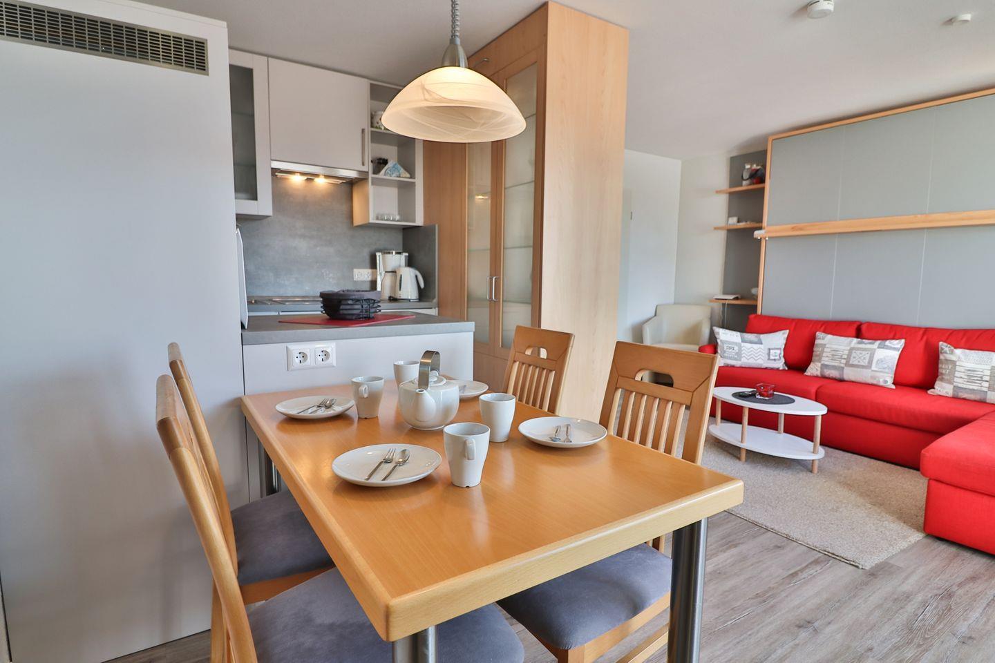 Das Ein-Raum-Apartment verfügt über Sichtschutz an allen Fenstern, sodass für einen ruhigen Schlaf und Privatsphäre gesorgt ist. Jeder Winkel wird hier optimal genutzt. Basis für den kompakten Wohn-Schlafbereich ist ein gemütliches Sofa und das separate Bettelement. Das Schrankbett öffnet sich über dem Sofa und hat eine hochwertige Matratze/Lattenrost in der Größe von 160 x 200 cm. Ein Sessel sowie TV, eine HiFi-Anlage und ein Radio runden die Ausstattung ab und laden dazu ein, nach einem aktiven Tag auf der Insel zu entspannen. Zusätzlich stehen Ihnen Bücher und Spiele zur Verfügung, um auch an regnerischen Tagen für Unterhaltung zu sorgen.