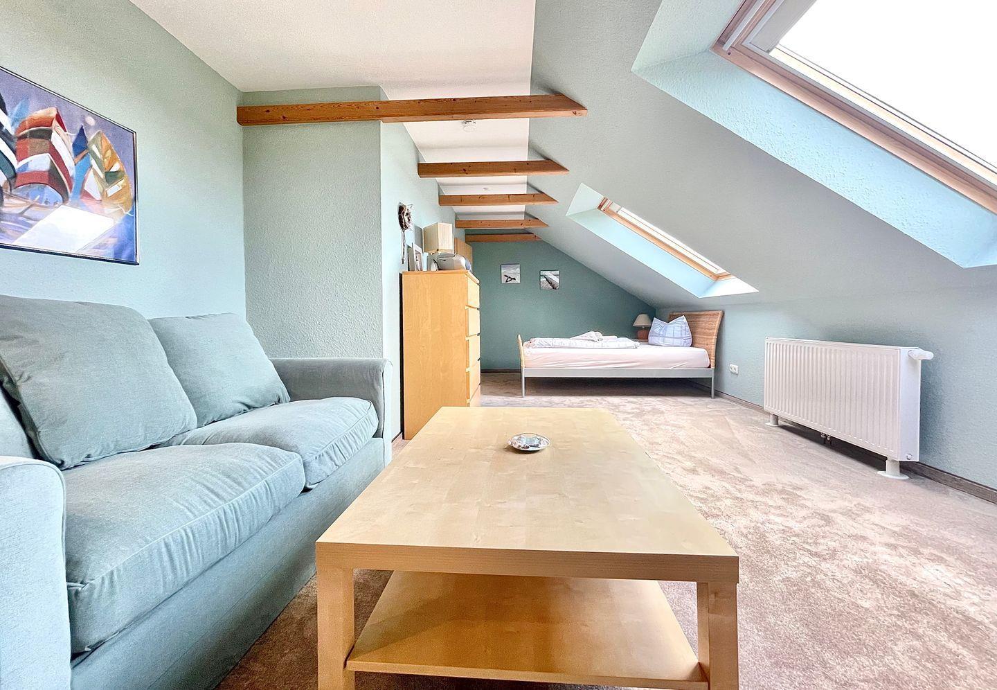 In dieser FeWo auf Langeoog gibt es zwei Schlafzimmer mit jeweils einem Doppelbett ( 180x200 und oben 140x200 ), das eine im Untergeschoss und das andere im geräumigen Obergeschoss, dieses ist durch eine Raumspartreppe zu erreichen, mit dazugehöriger Kuschelecke zum Relaxen.