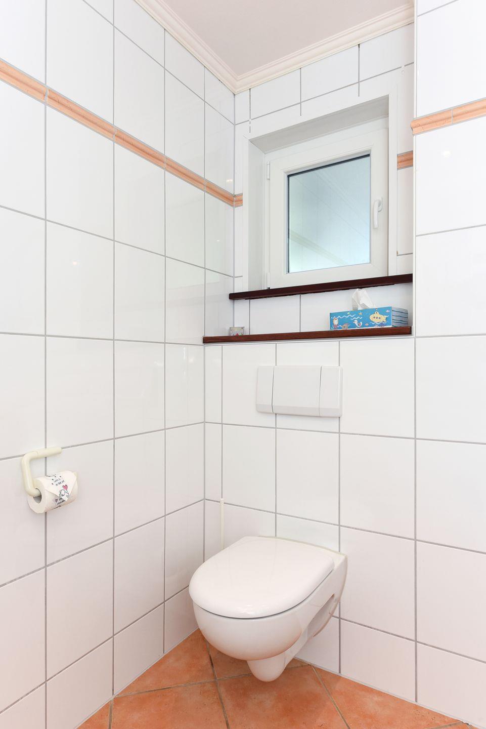 Das helle Tageslichtbad bietet 2 Waschtischen mit großem Spiegel und WC.