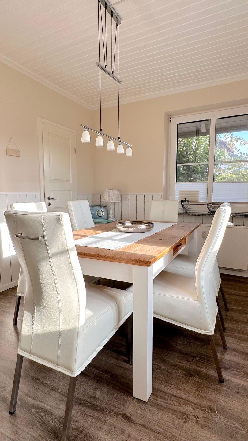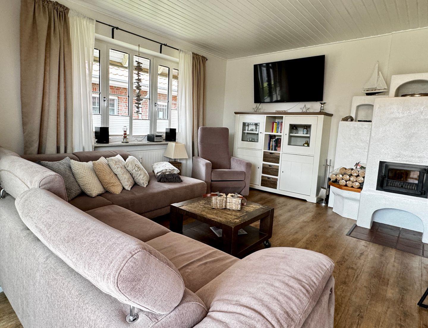Auf 120 Quadratmetern Wohnfläche erwarten Sie im Inneren des Hauses zwei Bäder (eines mit Dusche, eines mit Badewanne) sowie ein ansprechender Wohn- und Essbereich in edel-puristischem Stil mit viel Weiß und maritimen Anklängen. Winterabende in Ihrem Urlaub auf Langeoog verbringen Sie dort sicher gern vor dem gemütlichen Kaminofen.