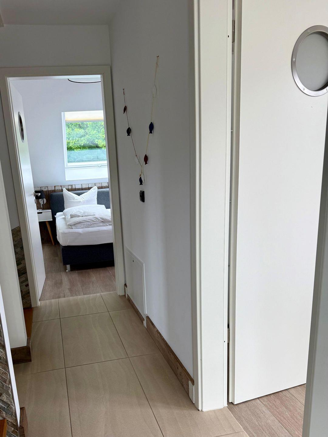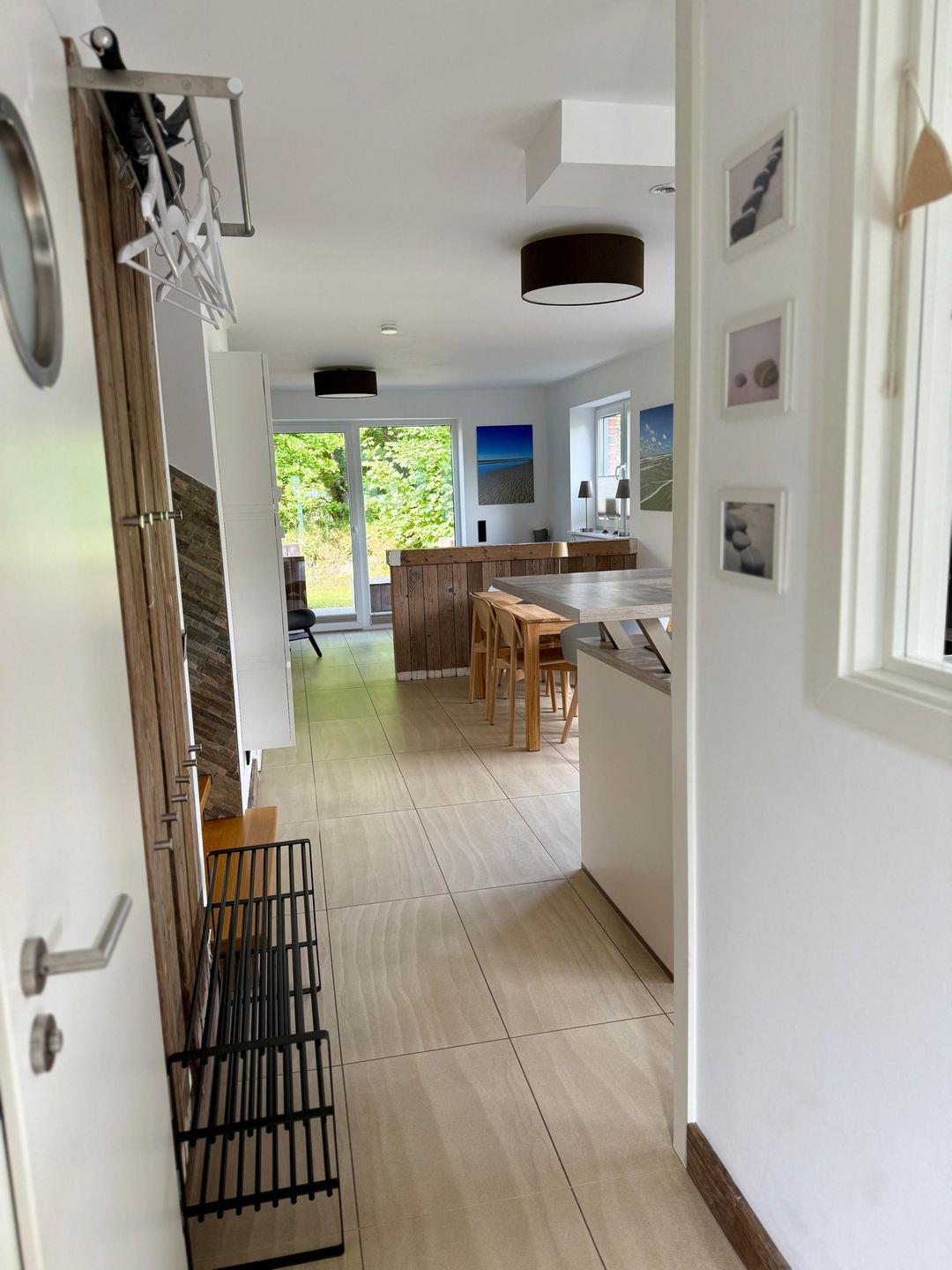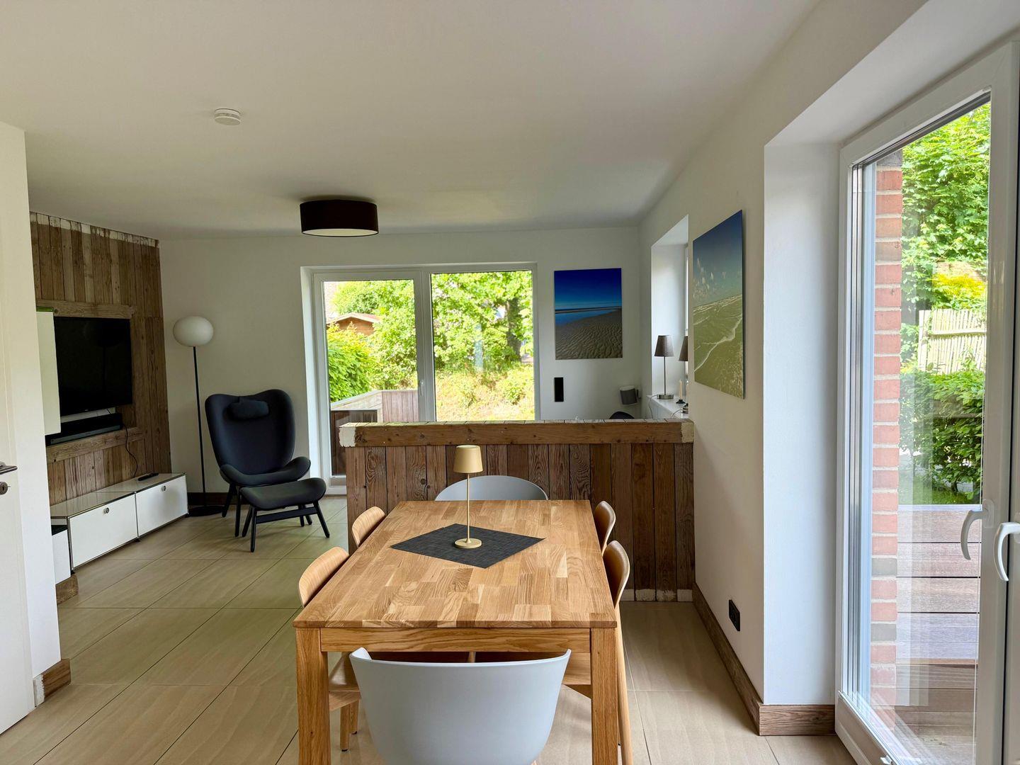 Das wunderschön und modern eingerichtete Reihenendhaus bietet neben einem großen Wohn- und Essbereich mit offener Küche zwei Schlafzimmer im ersten Stock. Davon verfügt das Elternschlafzimmer über ein Boxspring-Doppelbett und das Kinderzimmer, im Schiffscharakter, über ein Doppelbett mit darüber gebautem Einzel-Hochbett (nur für Kinder gedacht) welches über eine Leiter erreichbar ist. Die beiden weiteren Schlafplätze bietet die hochwertige, neue Schafcouch im Wohnzimmer - so hat das "Meerleben" Platz für sechs Erwachsene plus 1 Kind und 1 Baby (Hochstuhl und Reisebett sind vorhanden). Das Haus ist im skandinavisch-puristischer Stil eingerichtet mit elegant-maritimem Flair. Moderne, hochwertige Möbel und ein ausgesucht-stimmiges Farbkonzept verleihen den großzügig geschnittenen, lichten Räumen im Sommer wie auch im Winter Gemütlichkeit – nicht zuletzt durch den Kamin im Wohn-/Esszimmer.