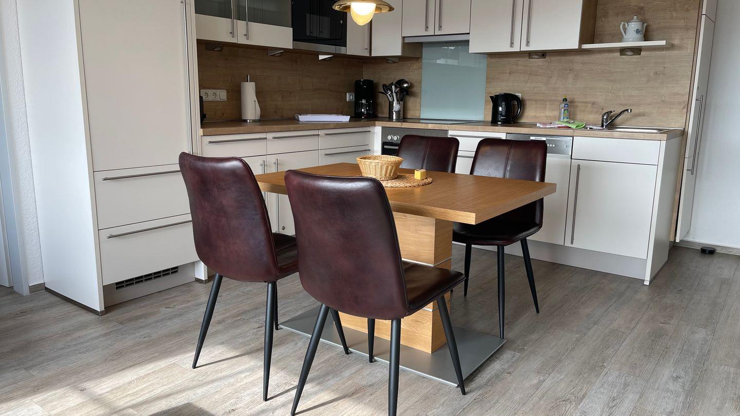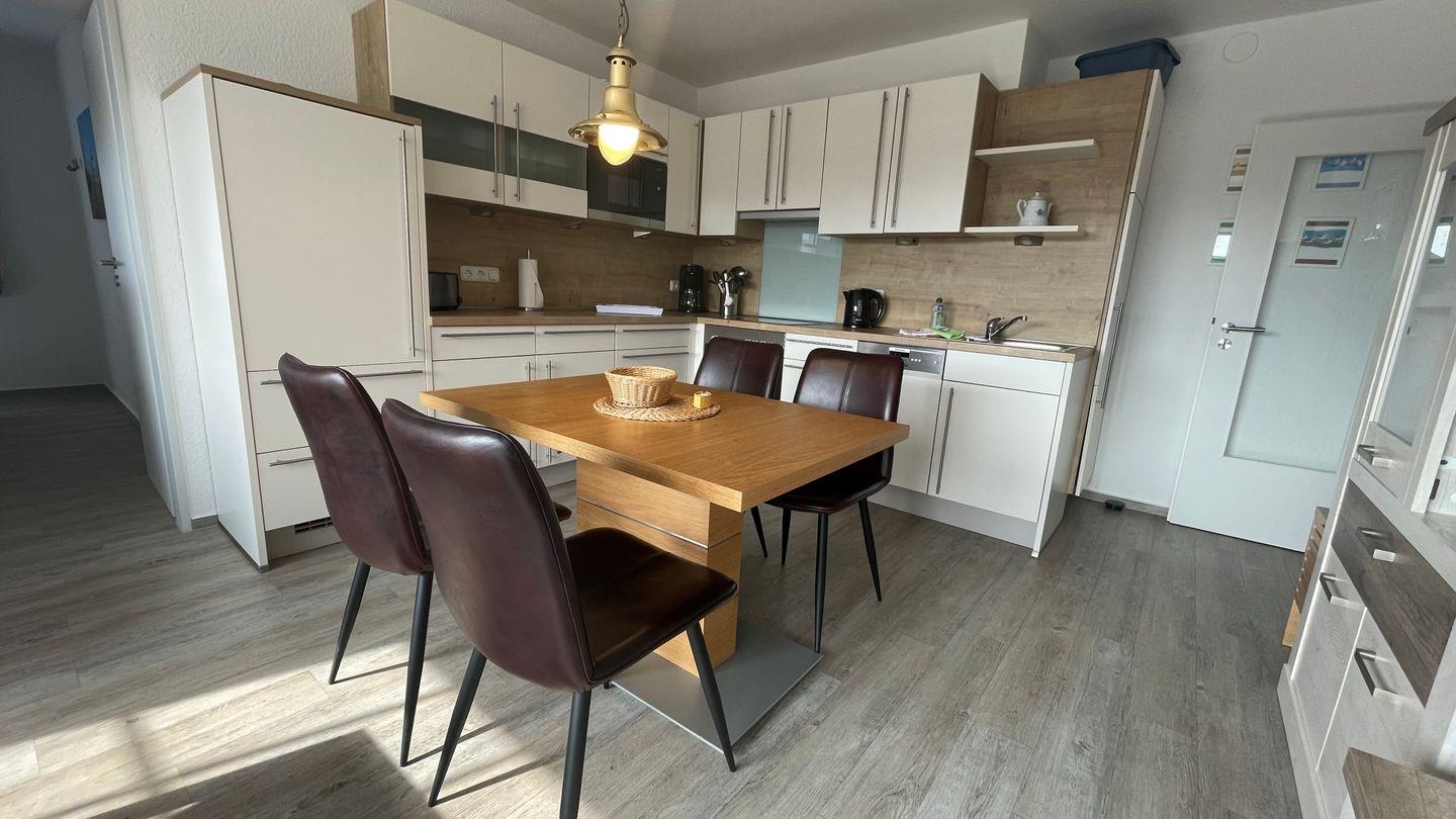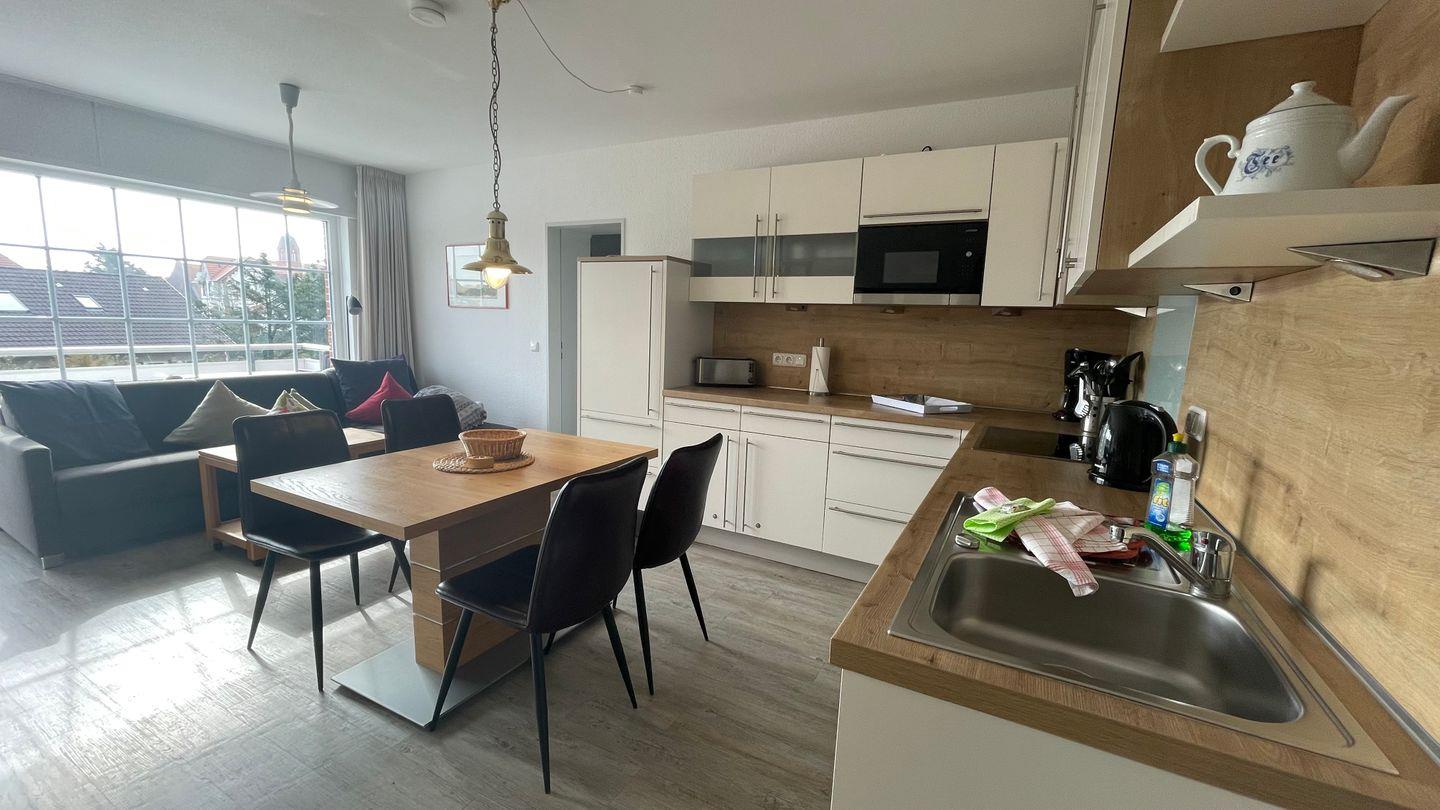 Die Ferienwohnung ist mit einem separaten Schlafzimmer mit Doppelbett (180x200 cm) ausgestattet und besitzt ein modernes Badezimmer mit Dusche und WC. Im gemütlichen Wohnzimmer, das mit einem Fernseher mit Hi-Fi-Anlage sowie einem DVD-Spieler versehen ist, gibt es ein Komfort-Schlafsofa (140x200 cm) - leider keine Kleinkinder möglich, da es keinen Stellplatz für ein Kinderbett gibt im Schlafzimmer. Der Wohnbereich ist mit der offenen Küche sowie dem Essbereich verbunden. In der großzügigen, voll ausgestatteten Küchenzeile zaubern Sie während Ihres Urlaubs auf Langeoog fantastische Mahlzeiten.