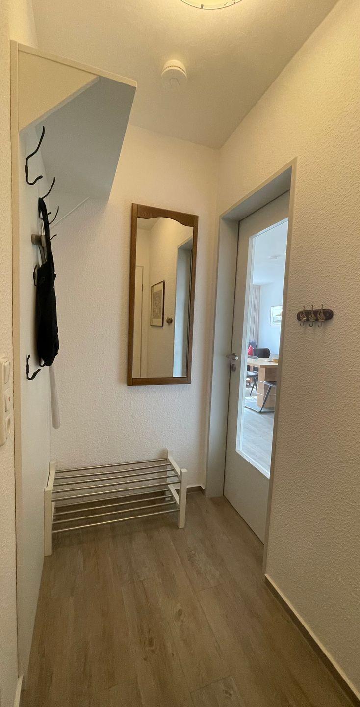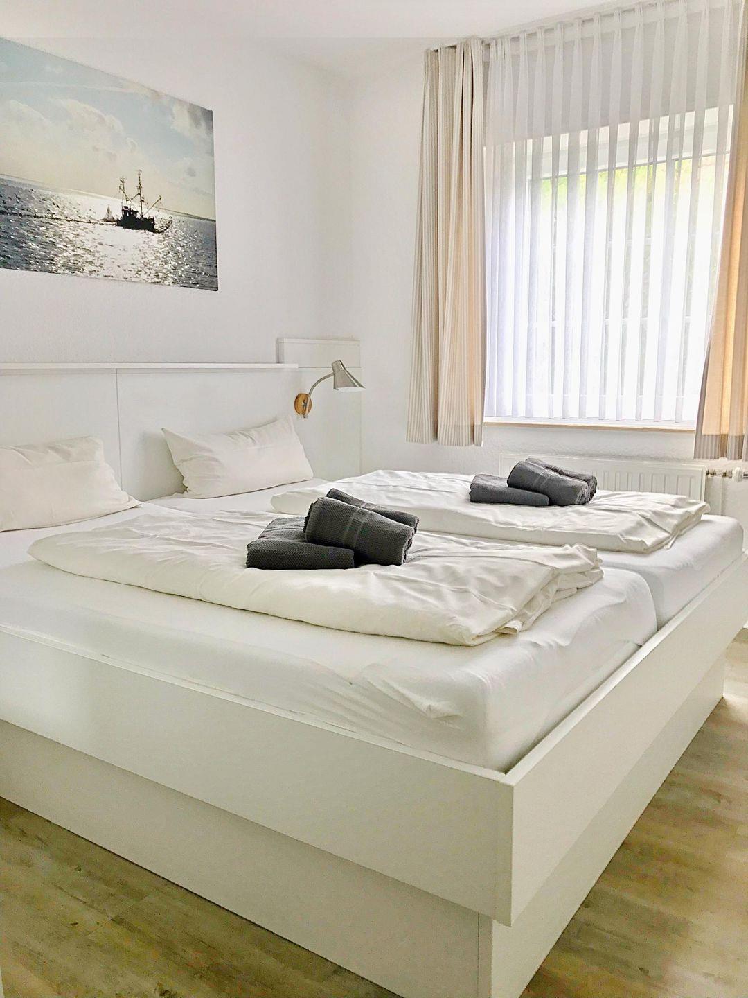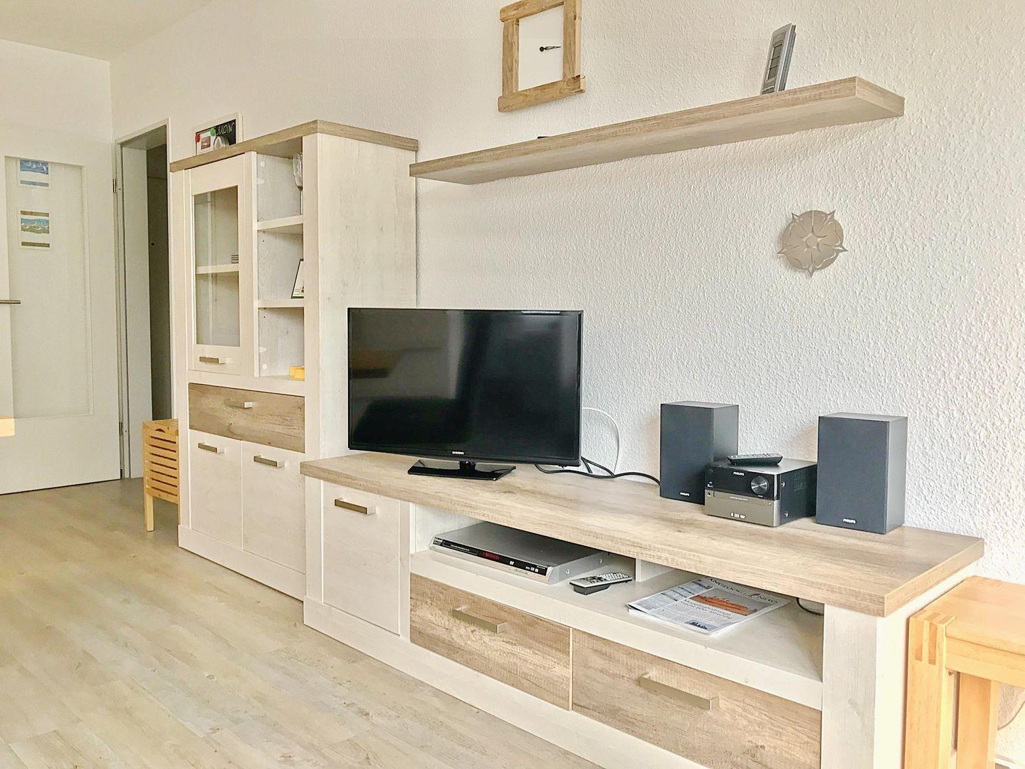 Die Ferienwohnung ist mit einem separaten Schlafzimmer mit Doppelbett (180x200 cm) ausgestattet und besitzt ein modernes Badezimmer mit Dusche und WC. Im gemütlichen Wohnzimmer, das mit einem Fernseher mit Hi-Fi-Anlage sowie einem DVD-Spieler versehen ist, gibt es ein Komfort-Schlafsofa (140x200 cm) - leider keine Kleinkinder möglich, da es keinen Stellplatz für ein Kinderbett gibt im Schlafzimmer. Der Wohnbereich ist mit der offenen Küche sowie dem Essbereich verbunden. In der großzügigen, voll ausgestatteten Küchenzeile zaubern Sie während Ihres Urlaubs auf Langeoog fantastische Mahlzeiten.