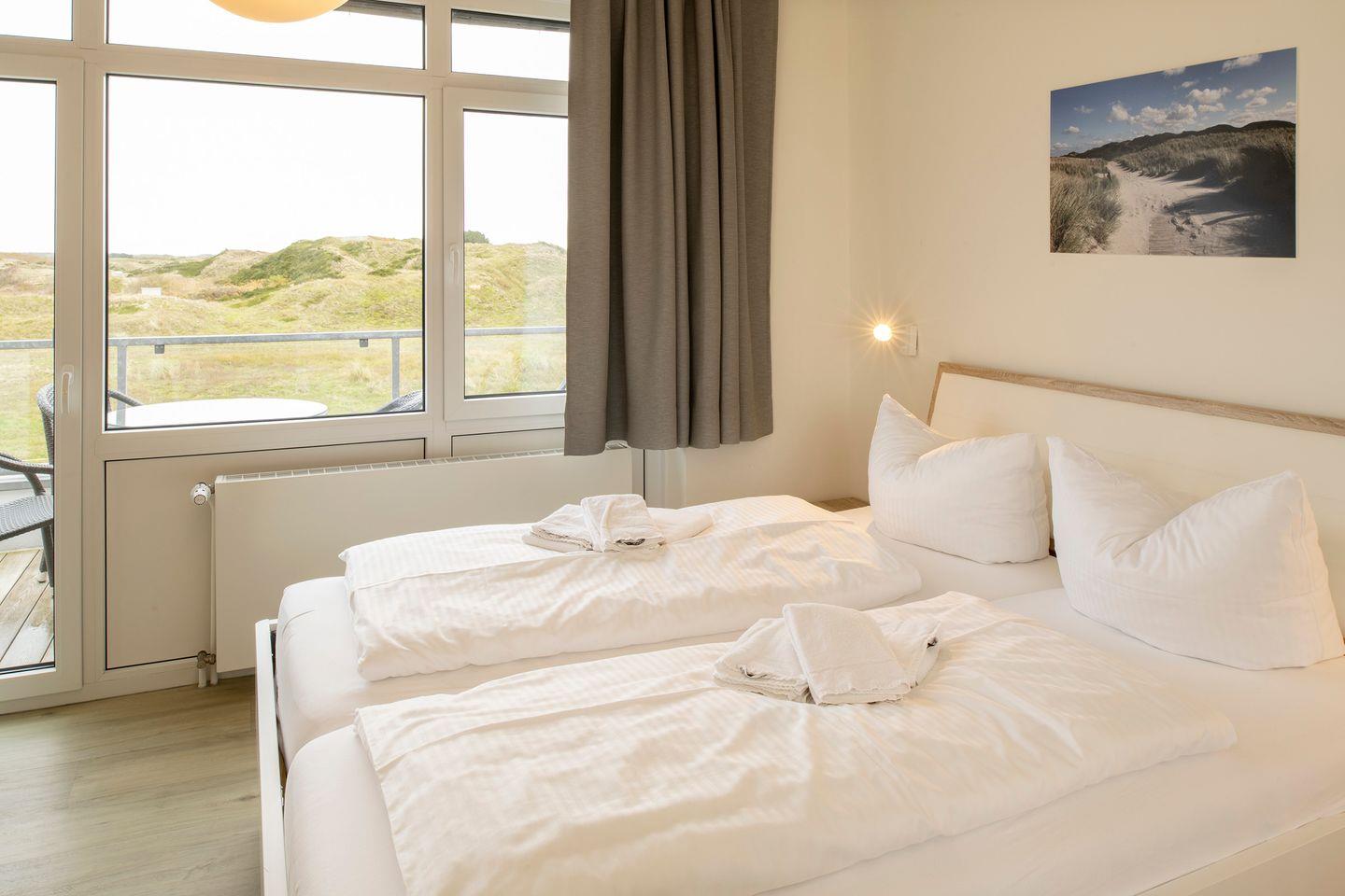 Die stylische Wendeltreppe führt in die 1. Etage zu den Schlafräumen. Ein Schlafzimmer verfügt über ein Doppelbett (160x200 cm). Der Raum besticht durch seine Panoramafensterfront mit einem atemberaubenden Blick in die Langeooger Dünenwelt. Vom angrenzenden großen Balkon genießen Sie die herrliche Luft und Landschaft samt tollen Sonnenaufgängen und können sogar das Meer rauschen hören. Im anderen Schlafzimmer zur Gartenseite hin befindet sich ein Doppelbett (180x200 cm). Auf Wunsch kann ein zusätzliches Kinderbett aufgestellt werden, sodass kleine Gäste dort gleich mit untergebracht werden können. Mittig der Etage befindet sich das großzügige Tageslichtbad mit geräumiger Dusche, WC und Waschtisch.