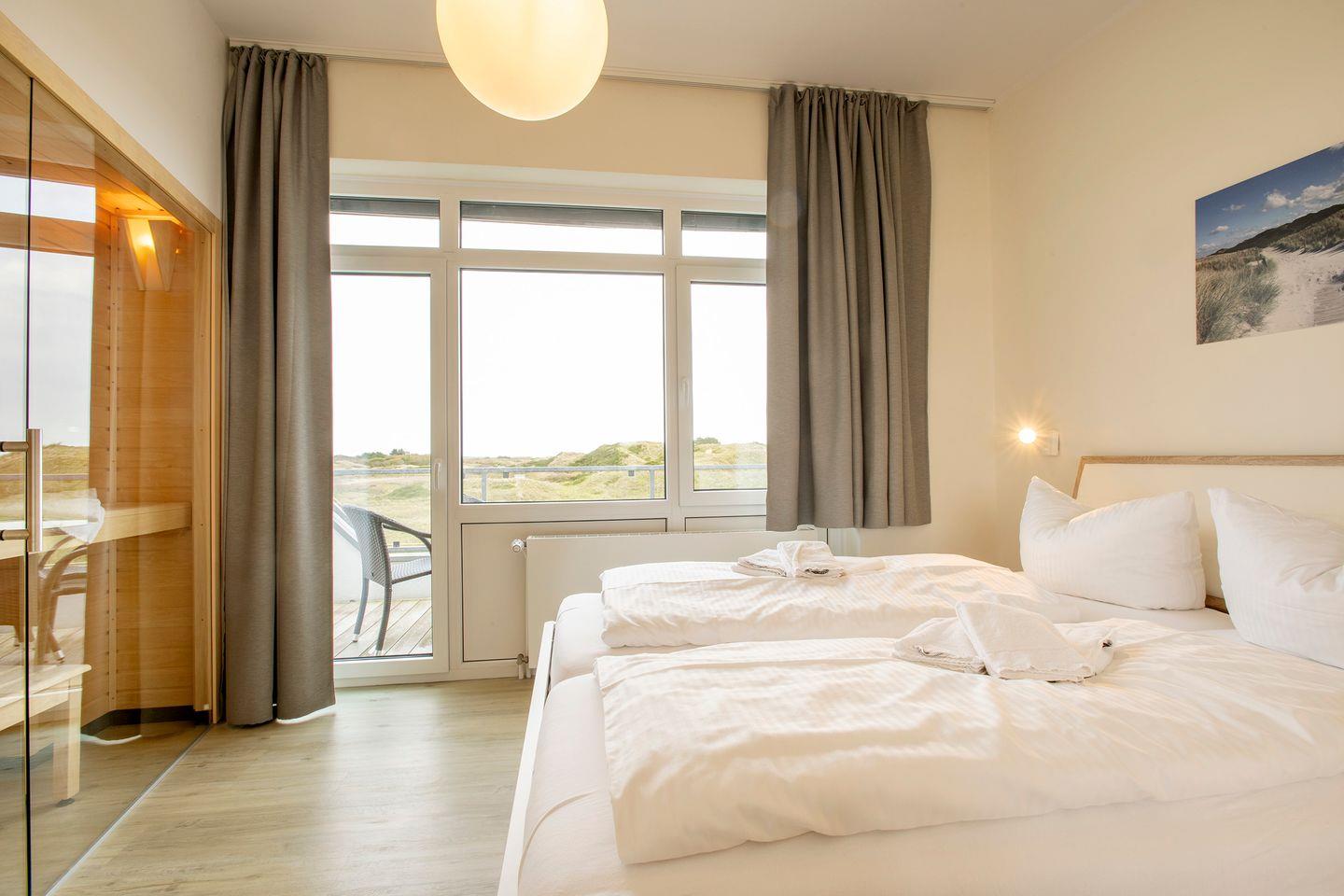 Weitere Highlights sind die finnische Sauna mit Dünenblick und 200cm Liegefläche, die Sie vom Schlafzimmer aus betreten mit einem phänomenalen Ausblick in die Dünenkämme vom Pirolatal.