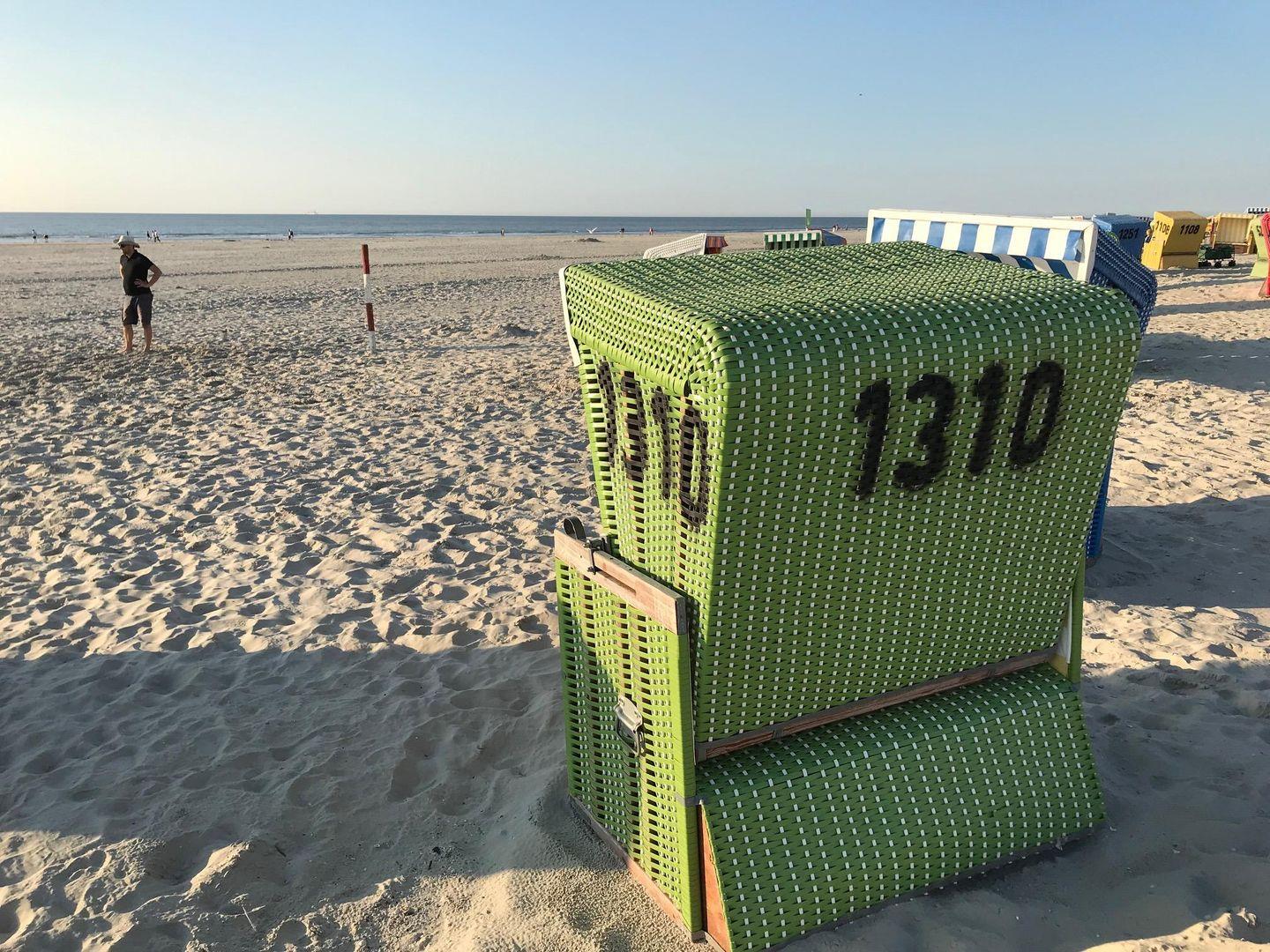 Im Sommer finden Sie den hauseigenen Strandkorb am Hauptbad, an den bunten Buden, in der ersten Reihe direkt am Meer.