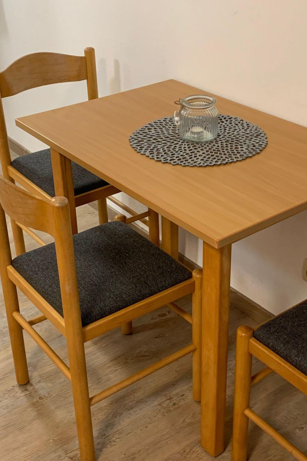 bathroom with bathtub, dining area for 2-3 persons and a south-facing terrace.