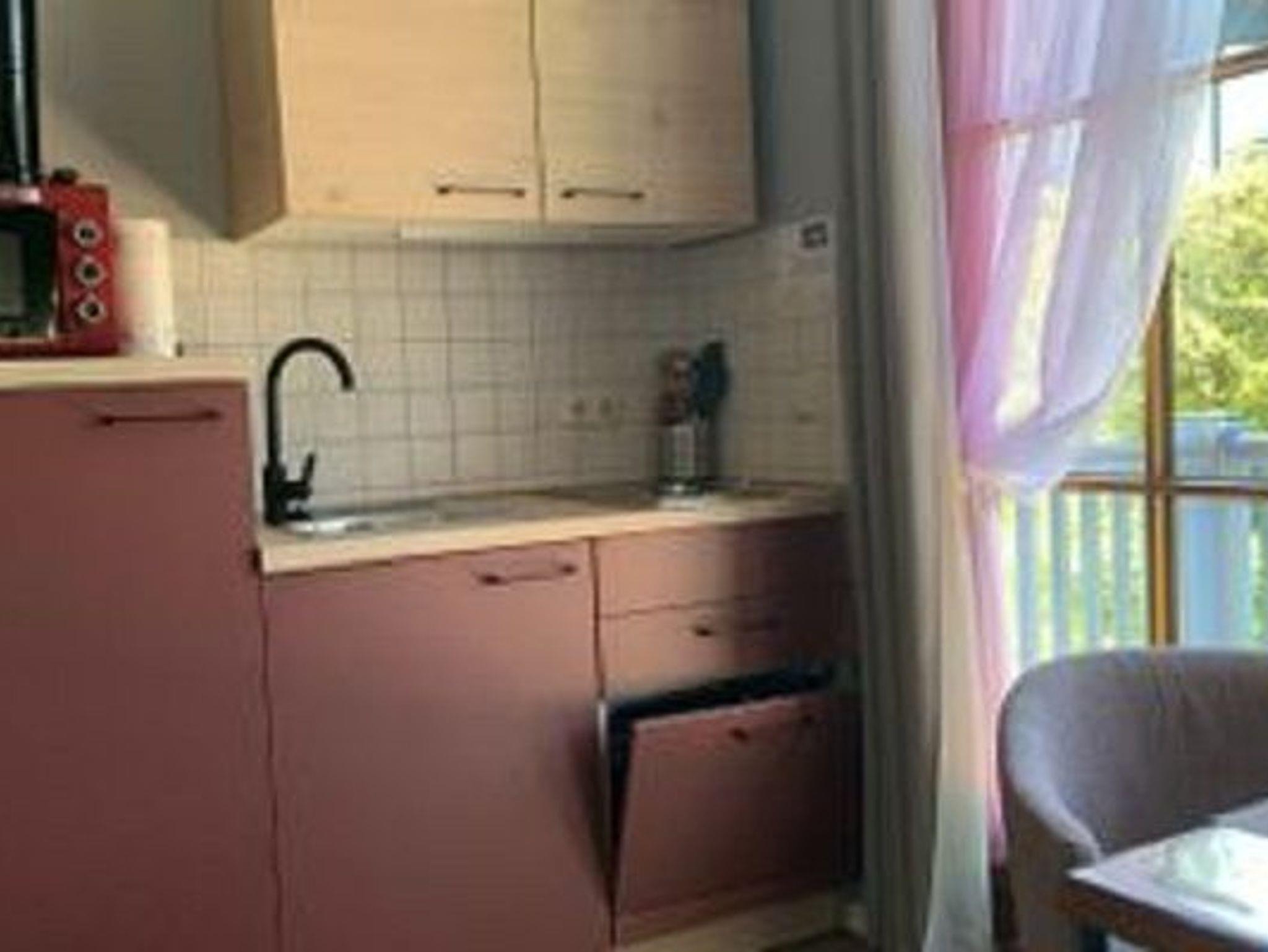 Studio circa 32 qm mit Küchenzeile, Doppelbett, Esstisch, kleiner Balkon und Bad mit Fenster