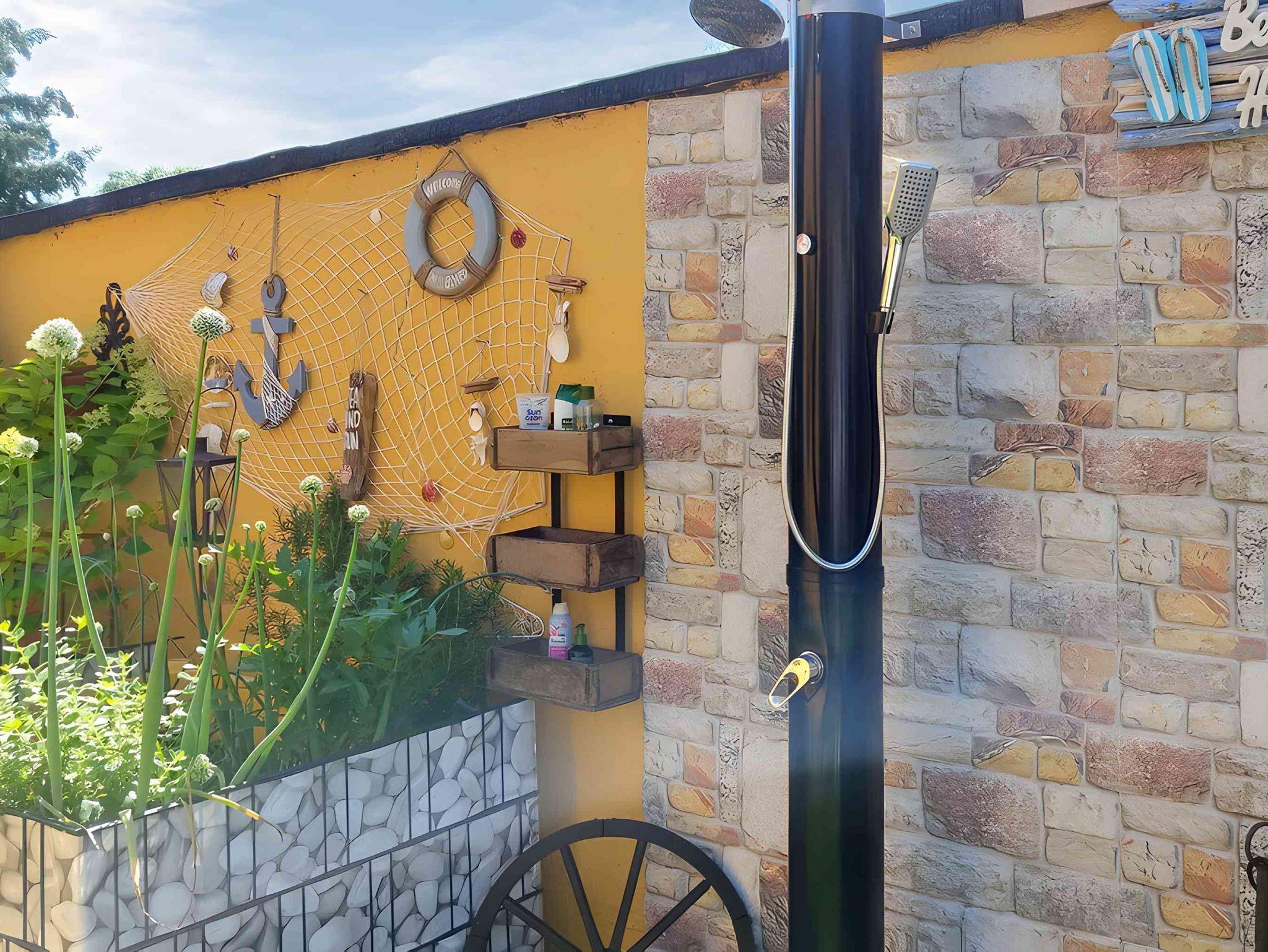 Im Außenbereich können Sie auf der möblierten Terrasse die frische Luft genießen, während der Grill für ein entspanntes Abendessen sorgt. Ein gesicherter Fahrradabstellraum sowie ein Parkplatz direkt vor dem Haus machen Ihre Anreise und Ausflüge noch angenehmer. Und das Beste: Der liebevoll gestaltete Garten, der sogar eine Solardusche bietet, lädt zum Verweilen und Entspannen ein.