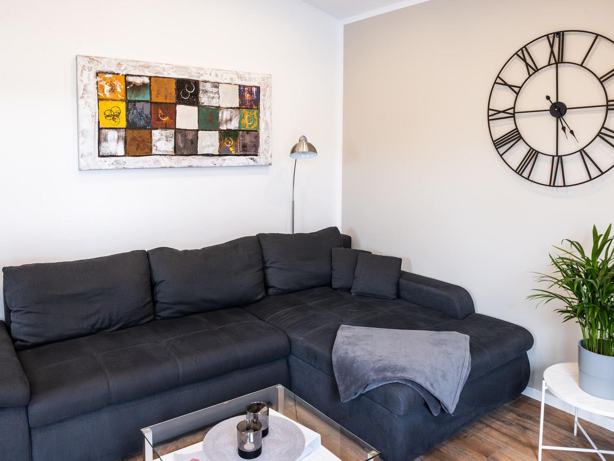 Im Wohnbereich könnt ihr auf der gemütlichen Couch vor dem Fernseher entspannen.