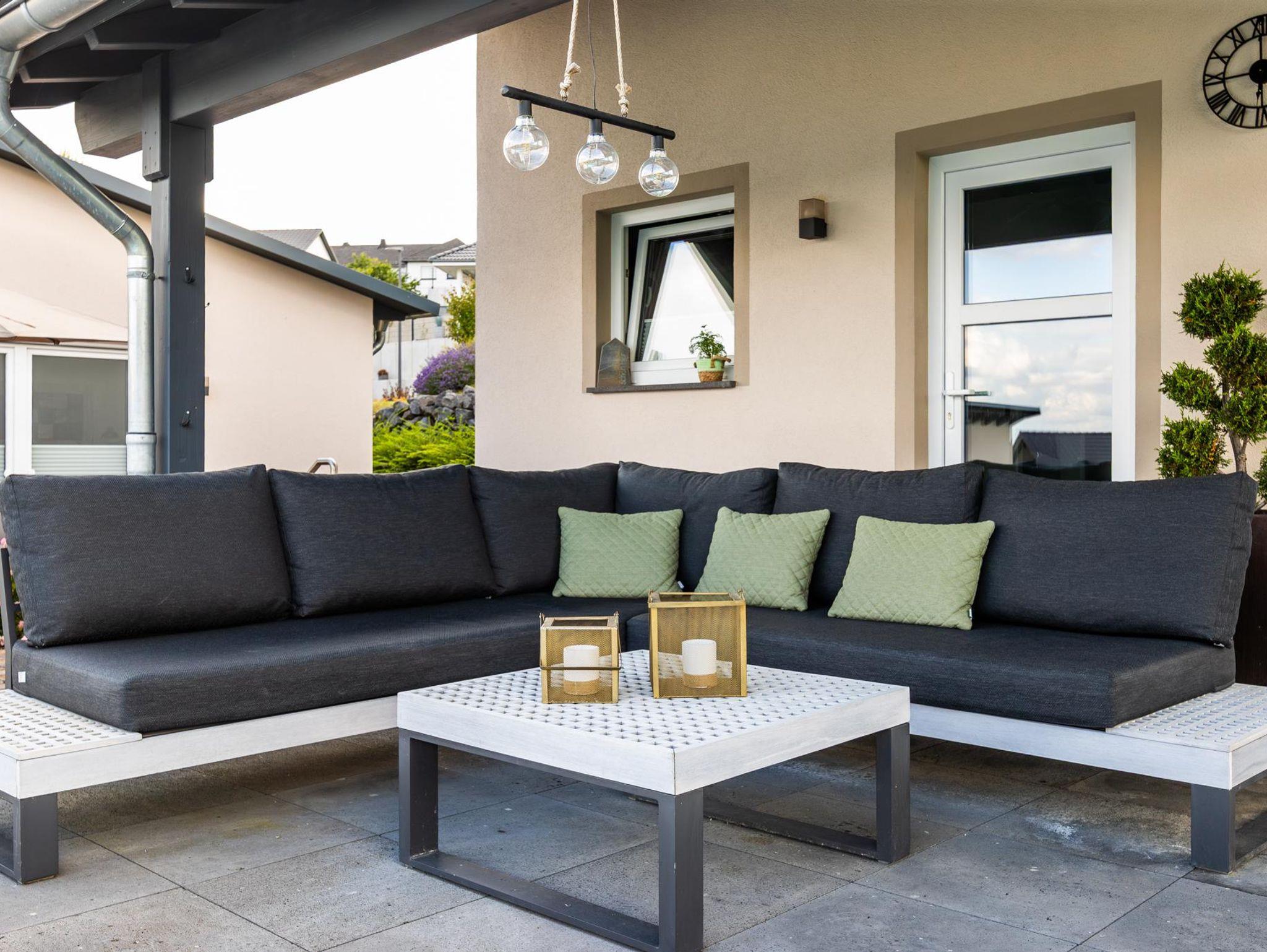 Die große Terrasse mit Gartenmöbeln, Sonnenschirm und Elektrogrill lädt zum geselligen Beisammensein ein.