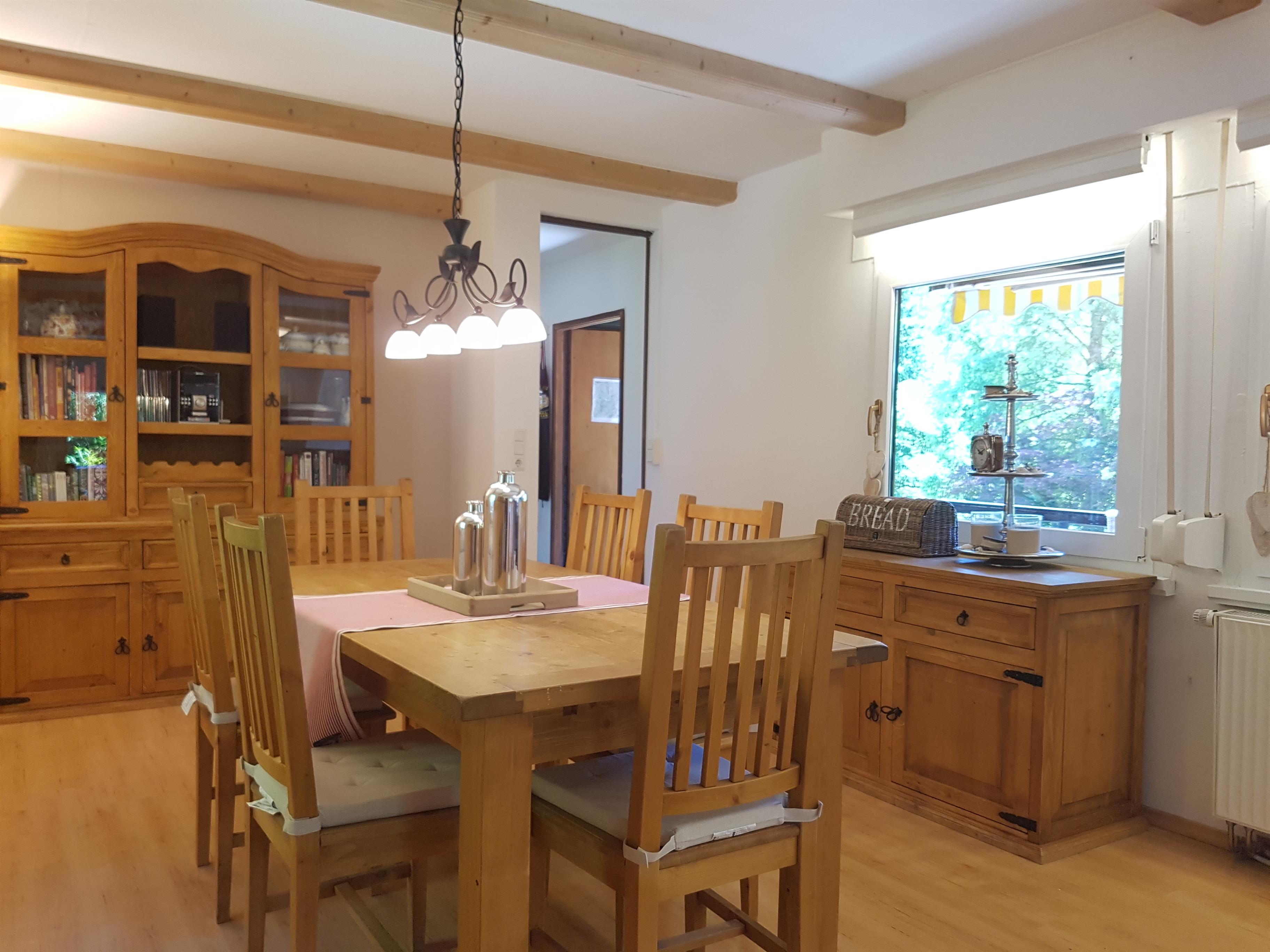Behaglichkeit und Komfort im Wohnzimmer mit einer Sitzecke, Innenkamin, UHD Fernseher mit Smart TV (mit Internetanbindung), DVD Player und eine Stereoanlage. Hier können Sie entspannte Abende in einer gemütlichen Atmosphäre beim Kaminfeuer und Kerzenlicht verbringen. Der großzügige Essbereich hat einen Zugang zum Balkon auf der Südseite des Hauses mit einem weiteren Esstisch. Unseren Gästen steht ein kostenloses schnelles W-Lan zur Verfügung.