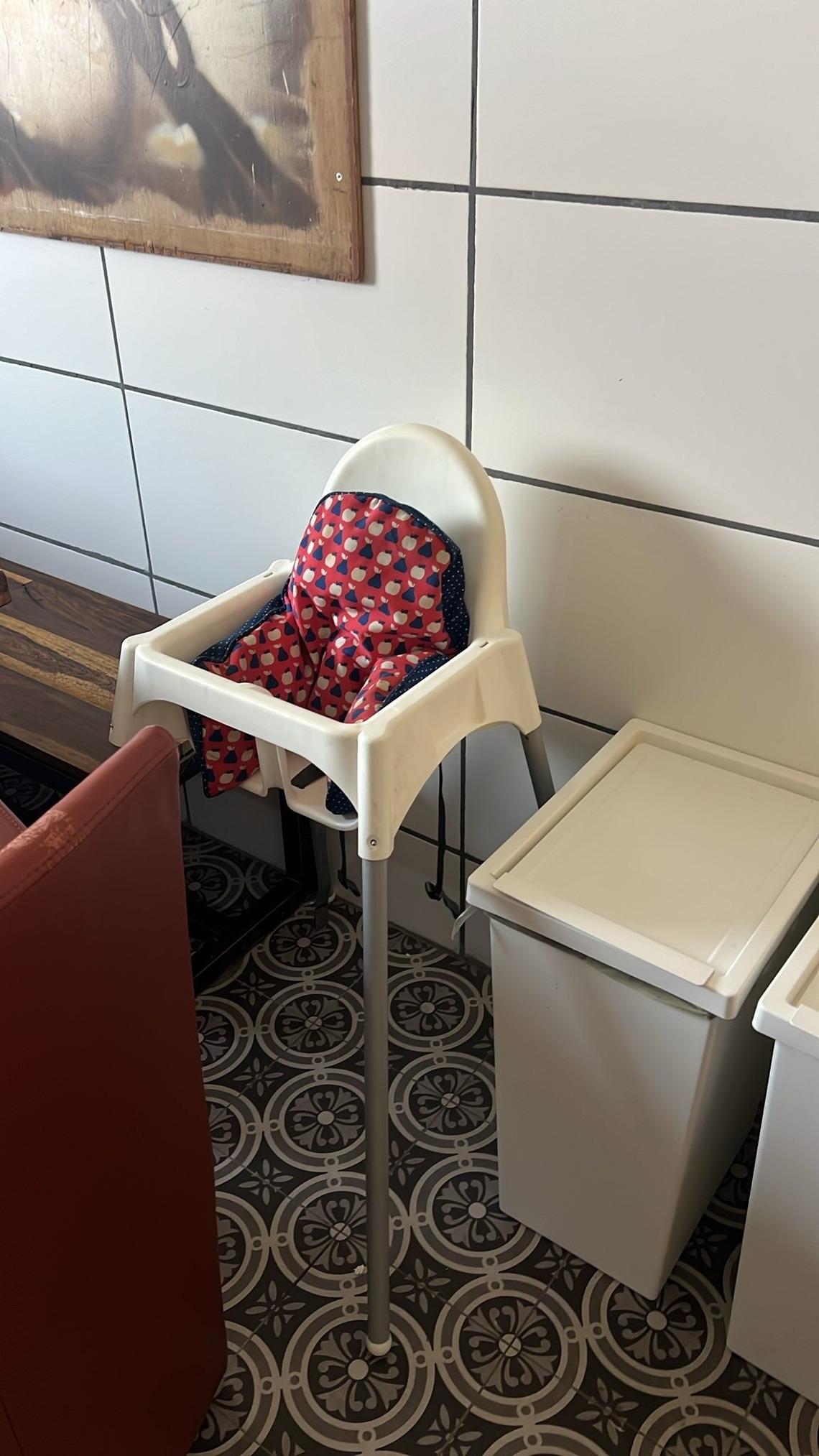 Küche und Esszimmer: Kühlschrank, Mikrowelle, Töpfe und Pfannen, Geschirr und Besteck, Schüsseln, Teller, Tassen usw., Gefrierschrank, Herd, Ofen, Wasserkocher, Kaffeemaschine, Toaster, Backbleche, Mixer, Grillbesteck, Esstisch mit Stühlen.