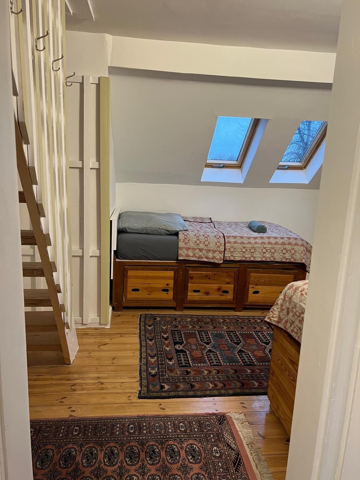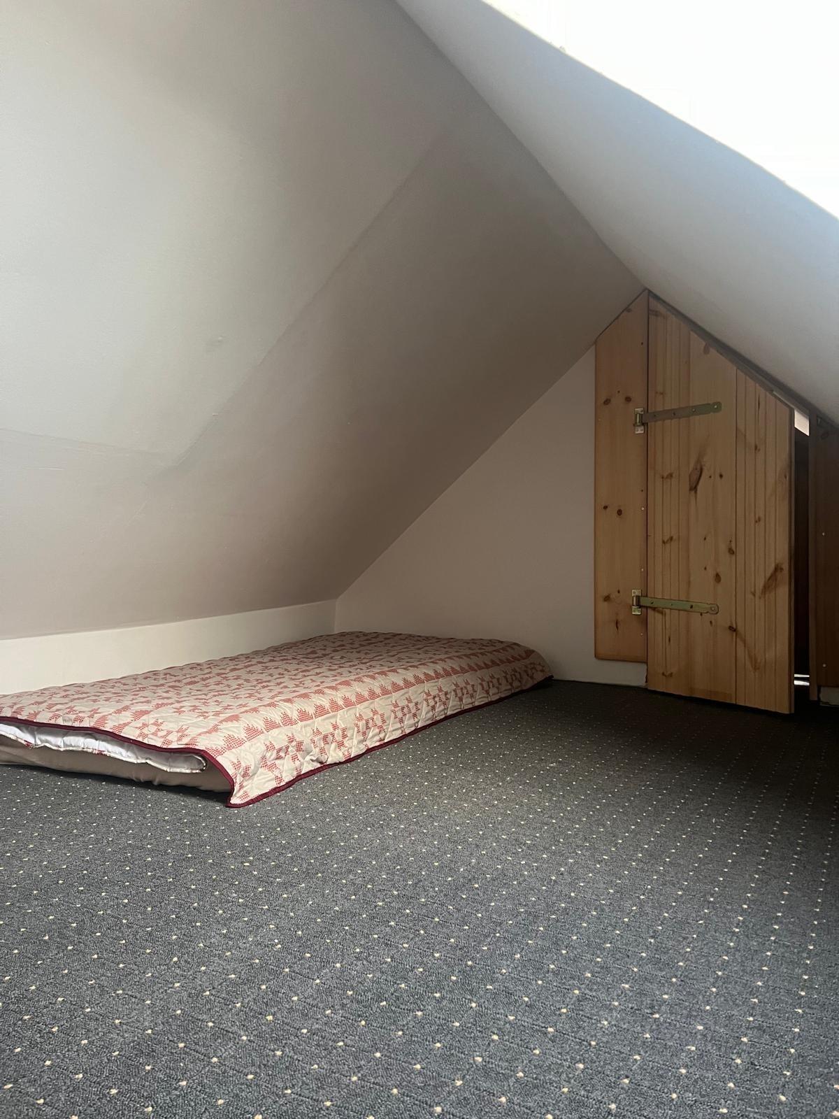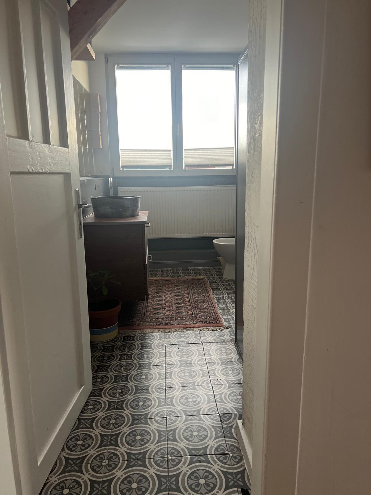 Ein Schafzimmer befindest sich im Dachstuhl mit einer Deckenhöhe von ca. 1,60 m. Im Dachstuhl sind 2 Schlafzimmer. Apartment erstreckt sich über 2 Etagen (Dachgeschoß + Dachstuhl). Es gibt 1 Bad mit WC und Dusche und ein separates Gäste WC.