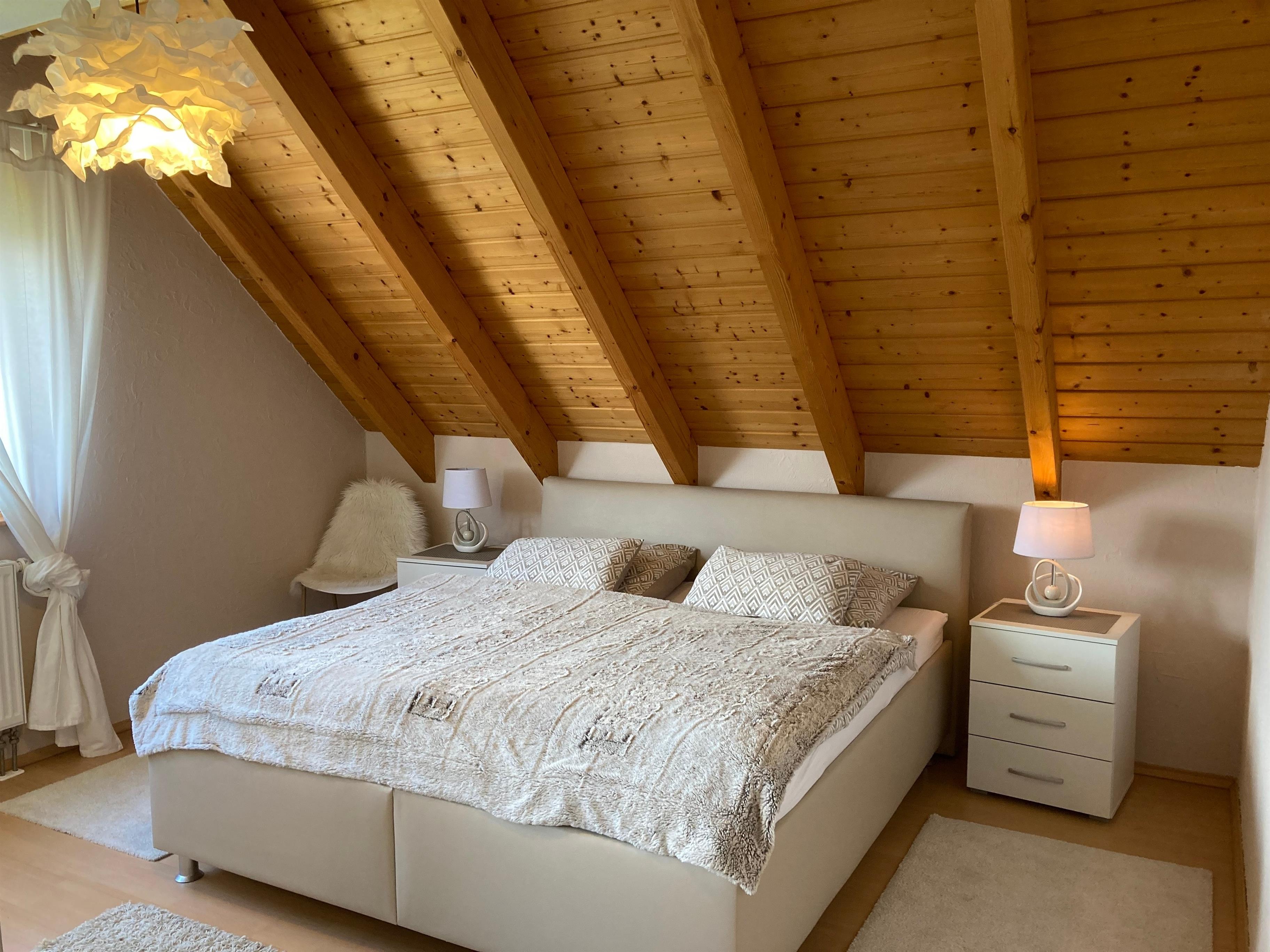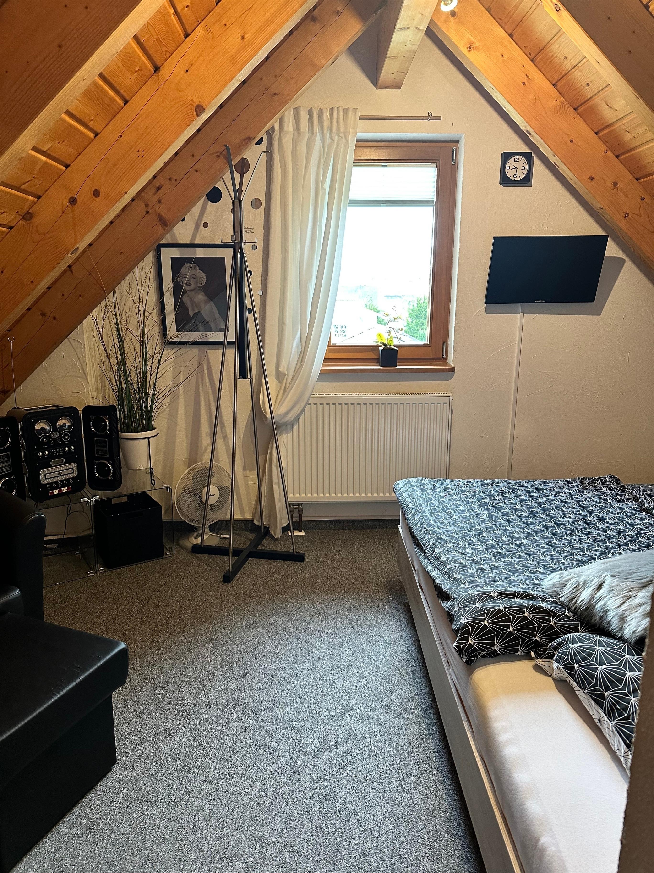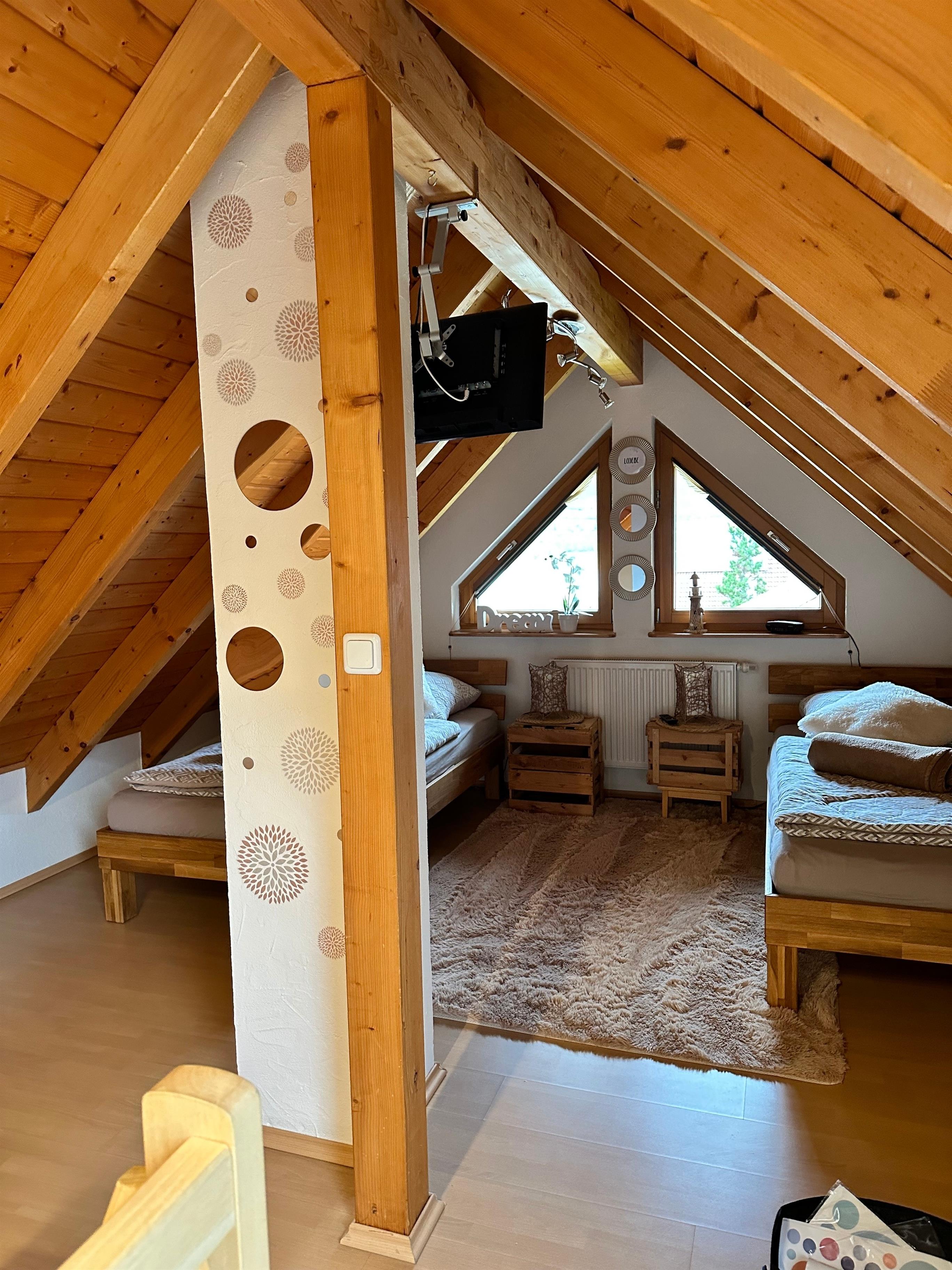 Im offenen Schlafraum mit Spitzboden und Dreieckfenstern befinden sich zwei auseinander stehende Betten a 1m x 2m. Diese können bei Bedarf auch gerne zusammen geschoben werden. Zur Ausstattung gehört ein Fernseher in fullHD Qualität und ein Radiowecker.