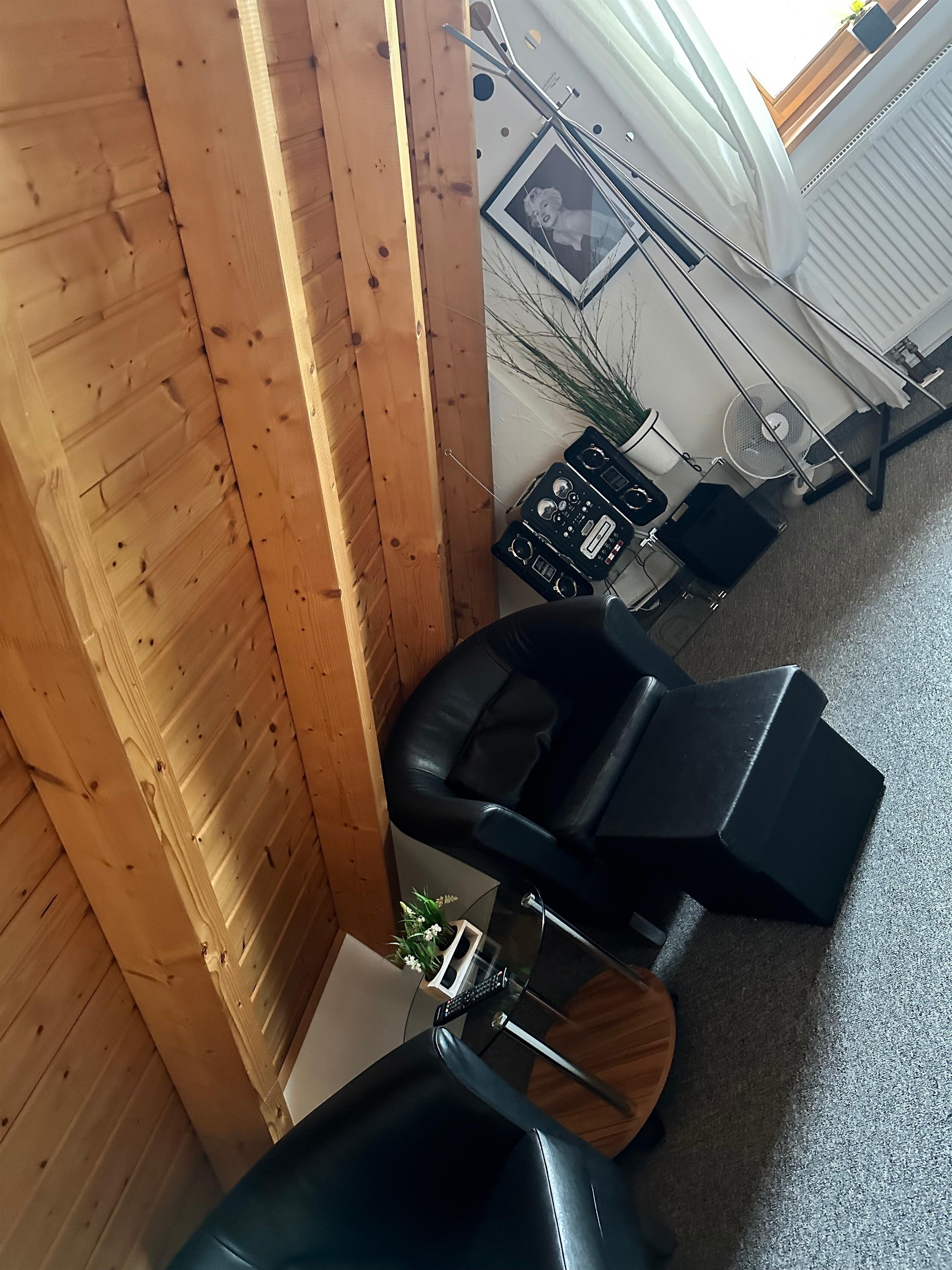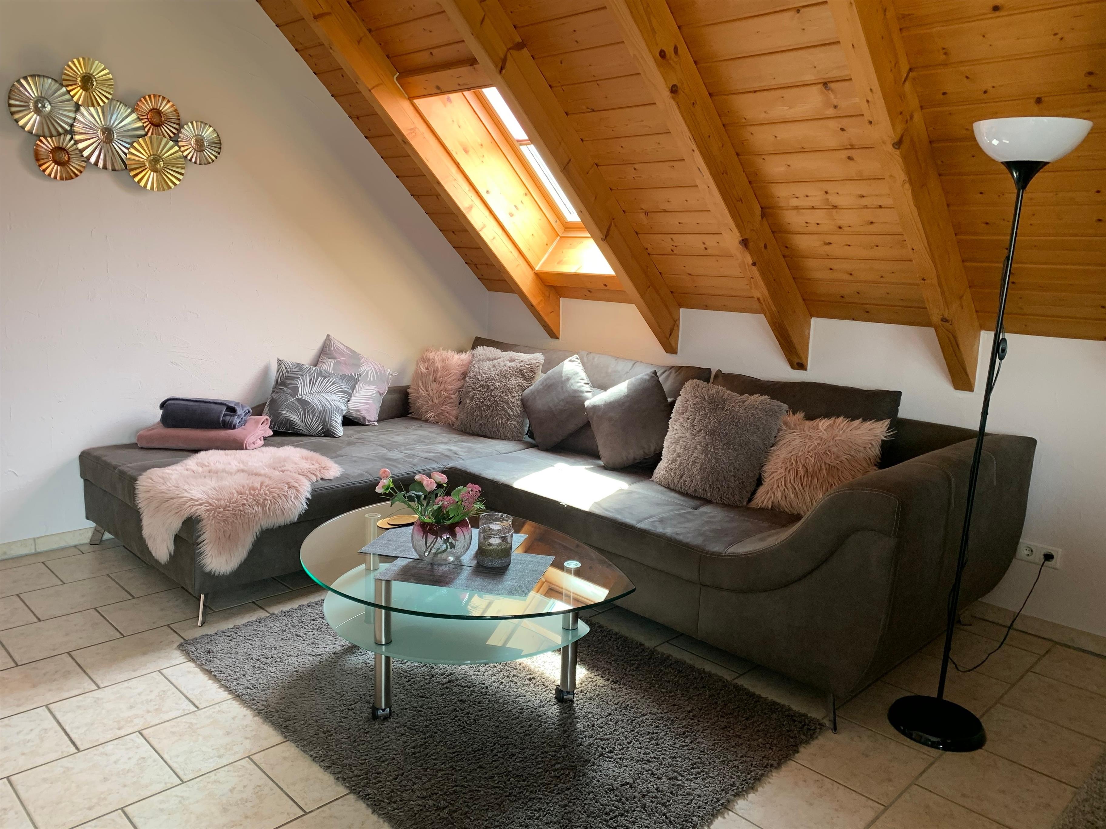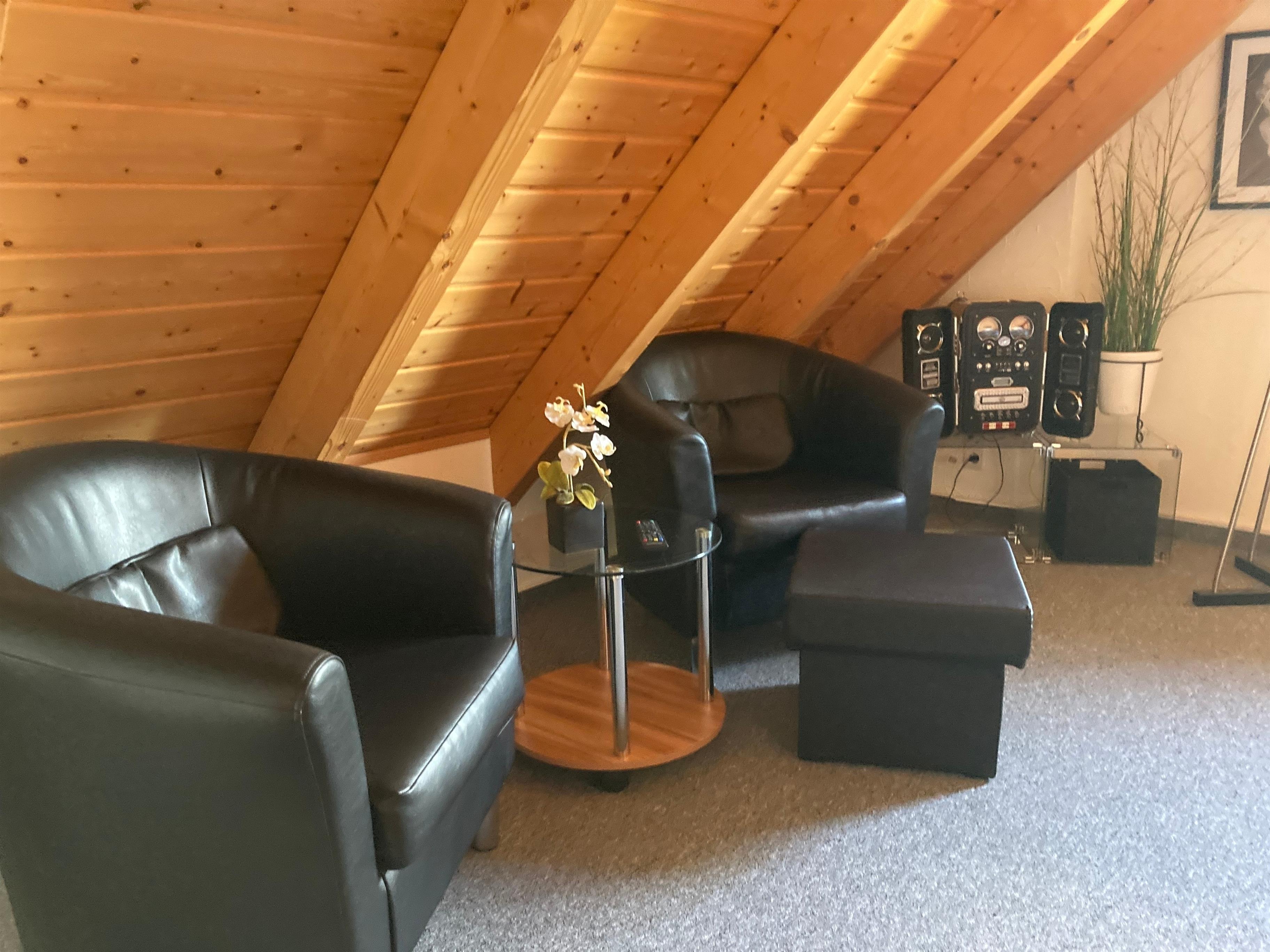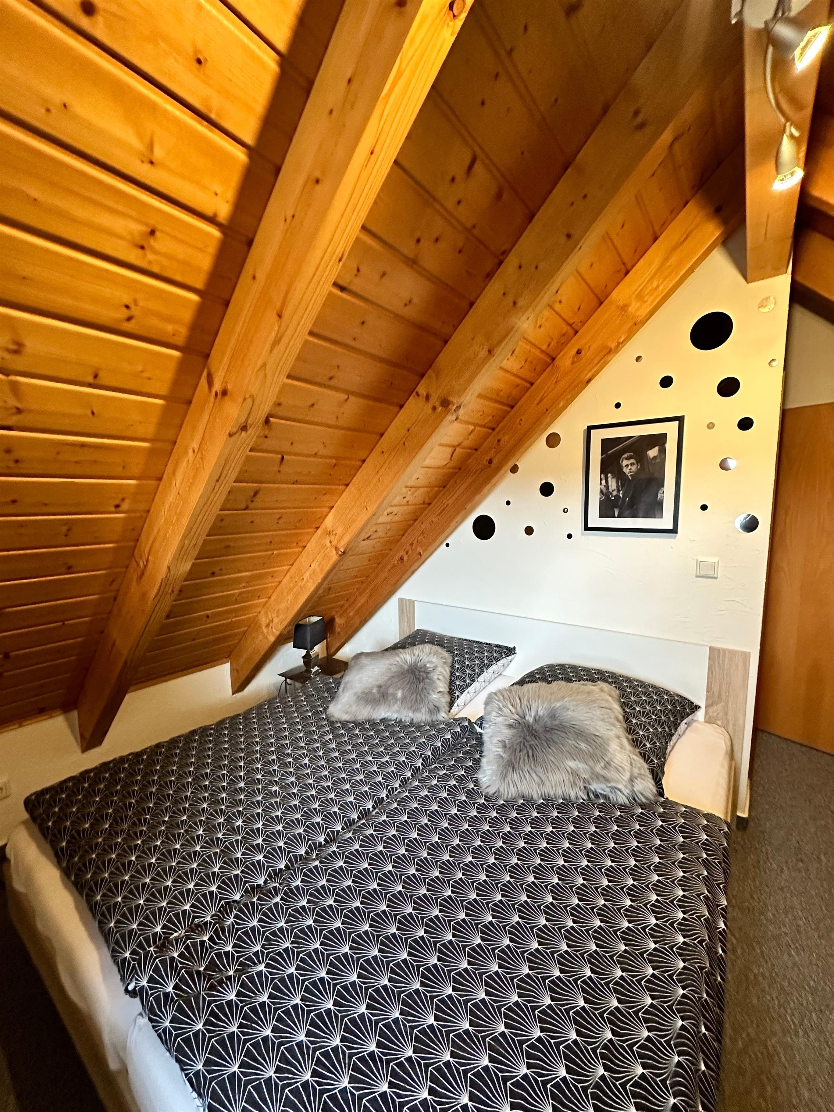 Im offenen Schlafraum mit Spitzboden und Dreieckfenstern befinden sich zwei auseinander stehende Betten a 1m x 2m. Diese können bei Bedarf auch gerne zusammen geschoben werden. Zur Ausstattung gehört ein Fernseher in fullHD Qualität und ein Radiowecker.