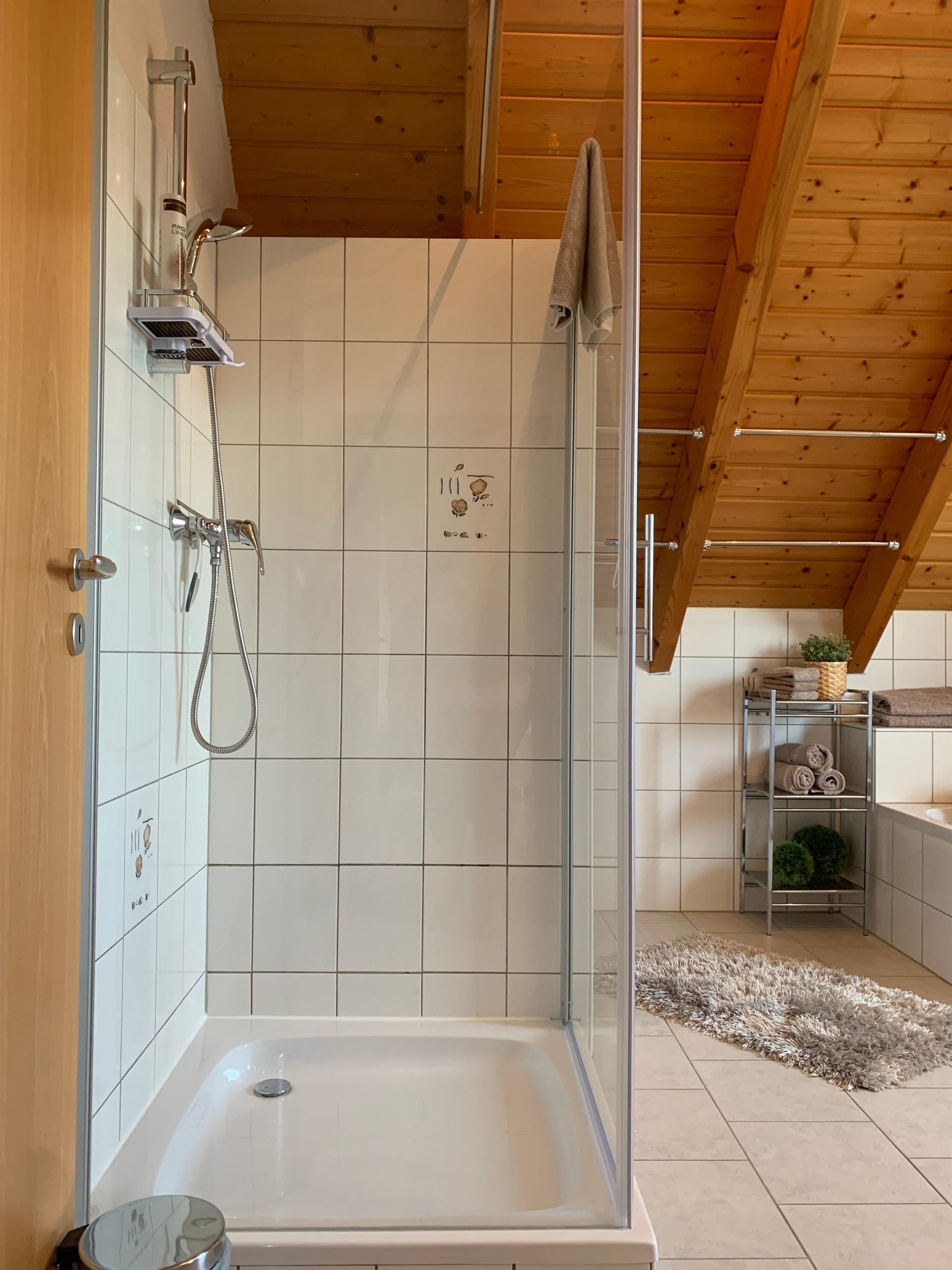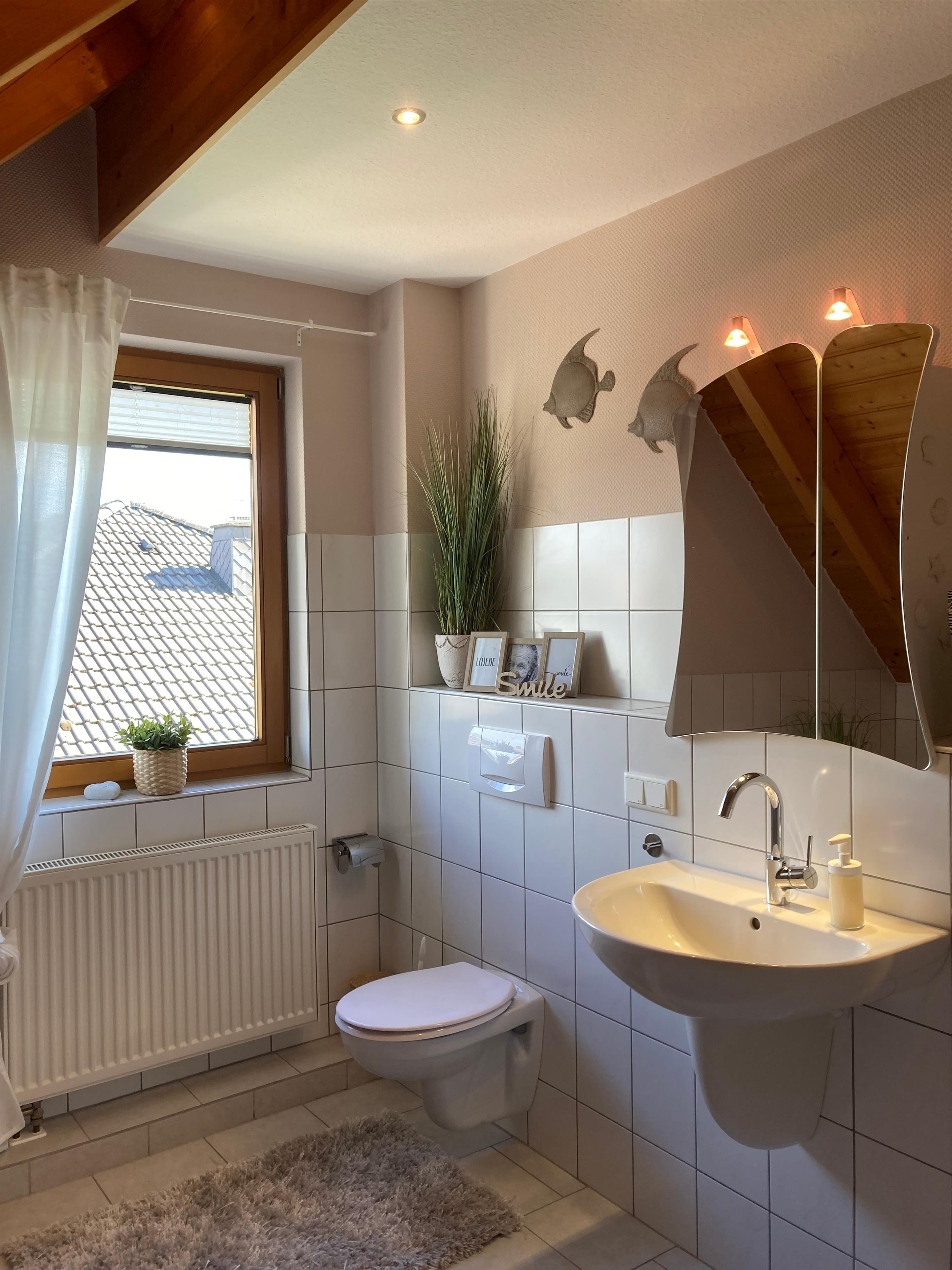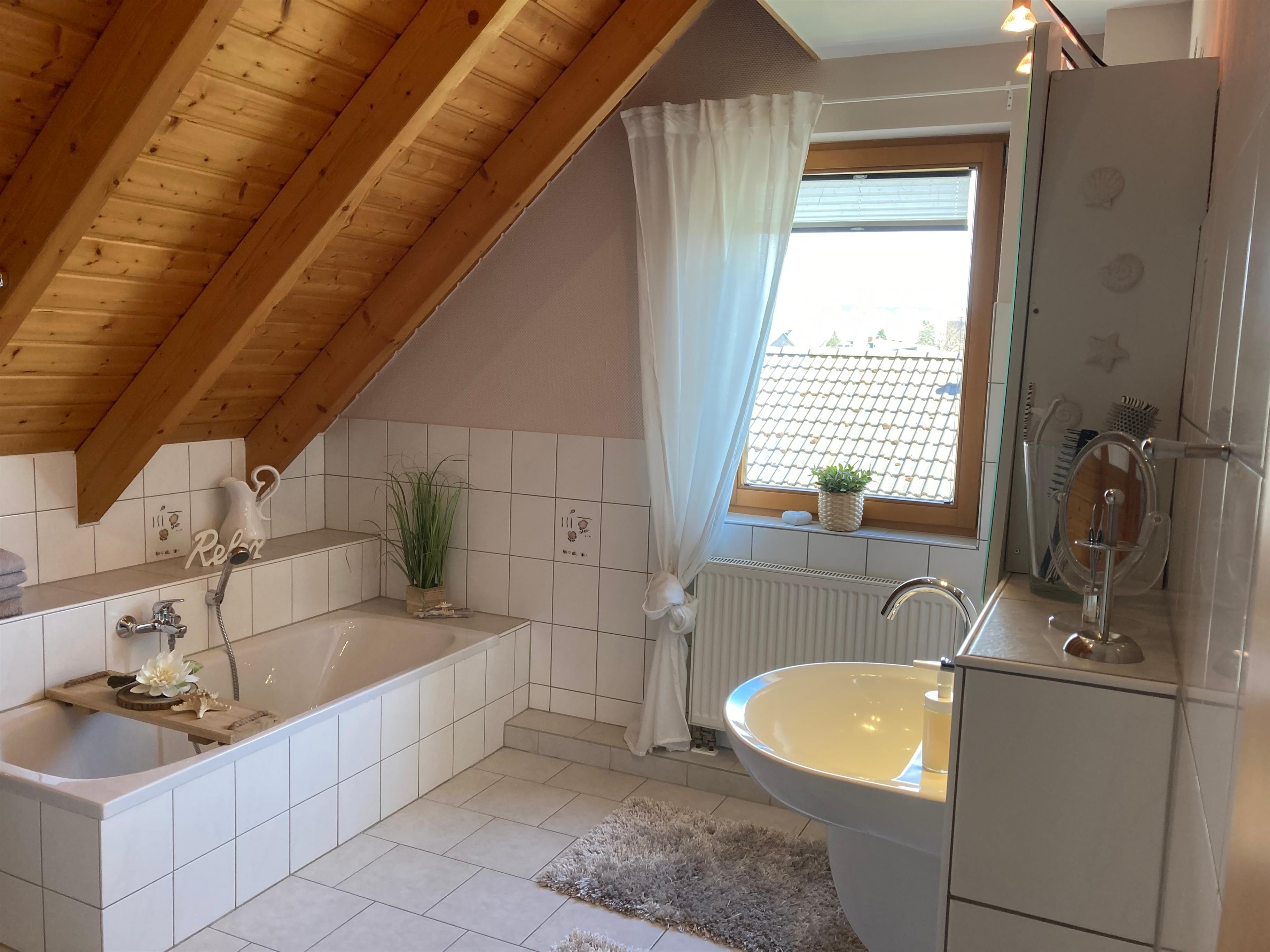 Das helle, freundliche Badezimmer lädt zu einer erfrischenden Dusche oder einem wohltuenden Bad ein. Handtücher, Duschtücher, Shampoo, Duschgel, Styling Utensilien, Kosmetikspiegel und Fön sind vorhanden.