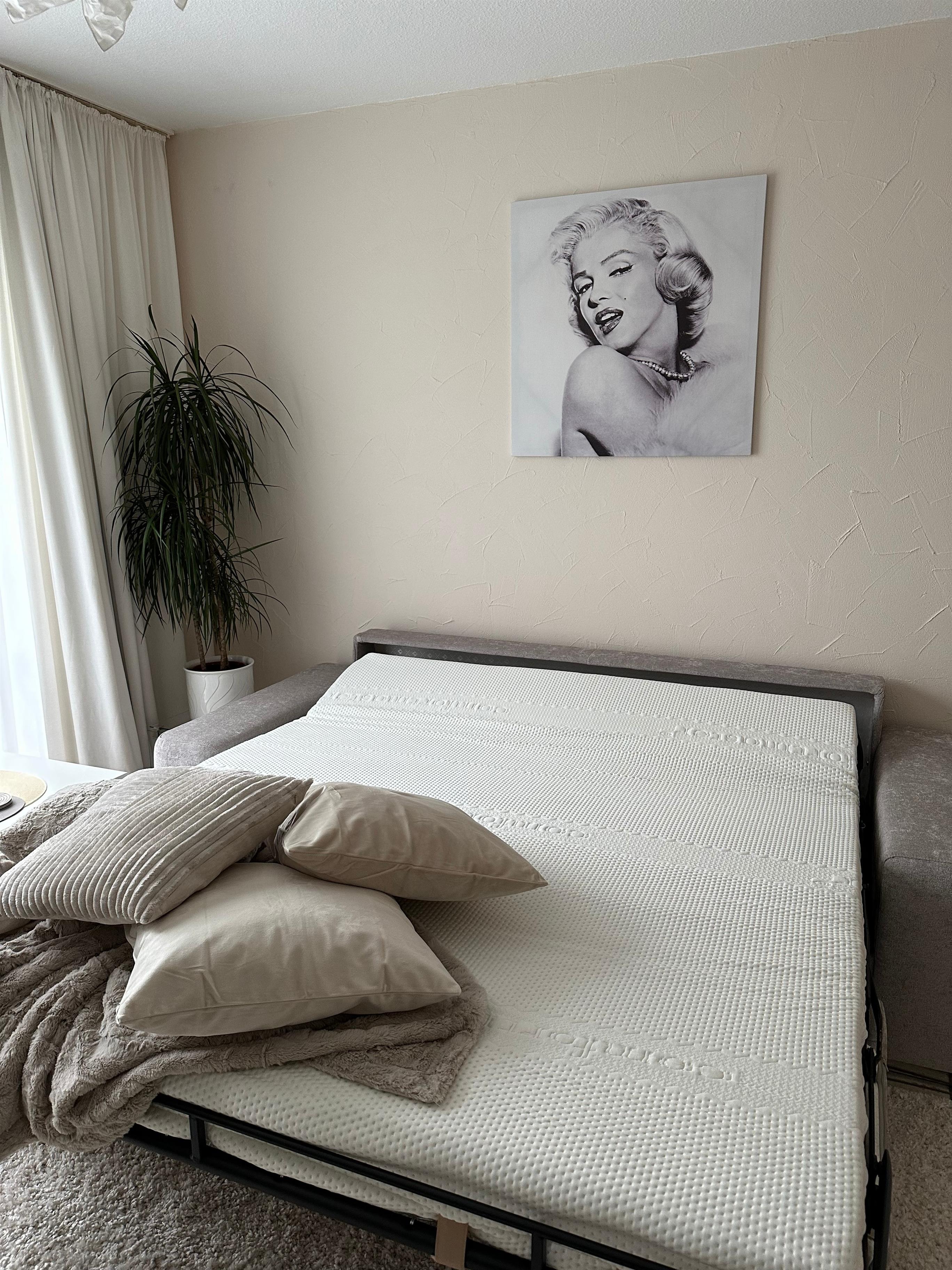Im Wohnzimmer steht ein bequemes, neues Sofa das als Schlafsofa für 2 Personen (180m x 2m) super schnell und bequem genutzt werden kann.