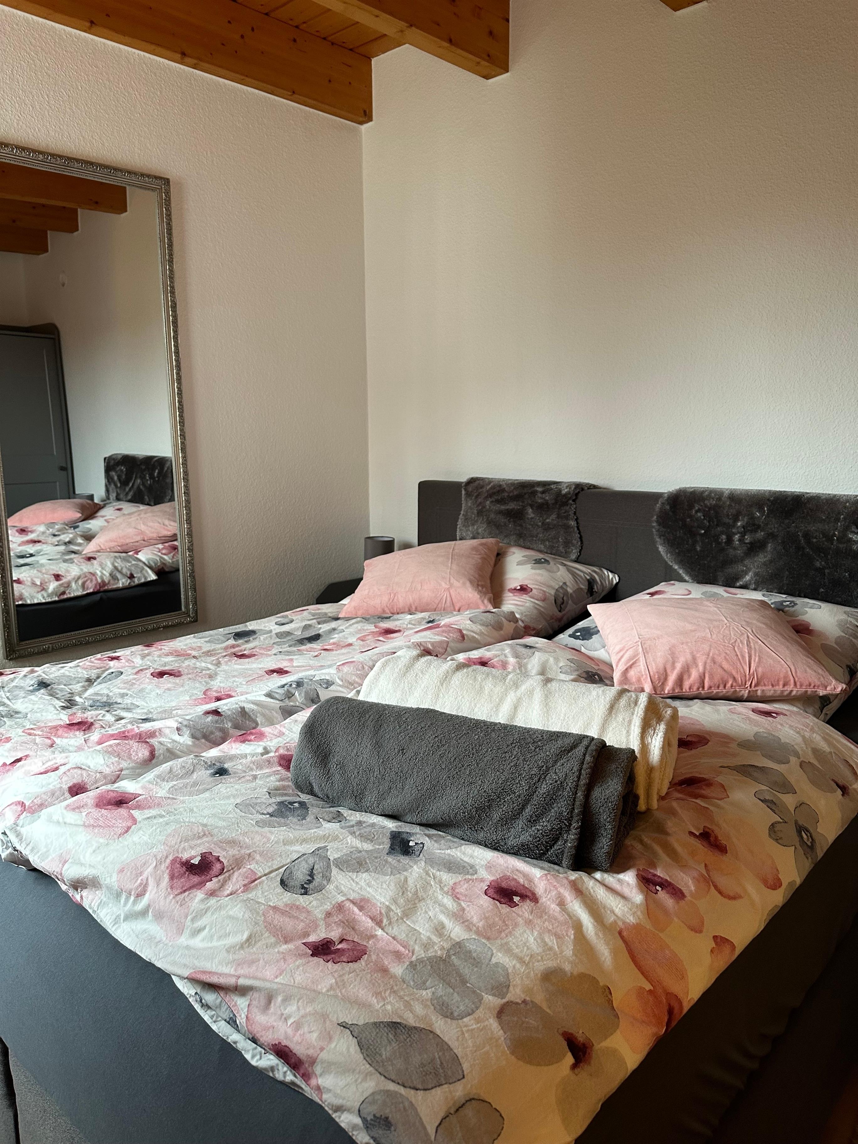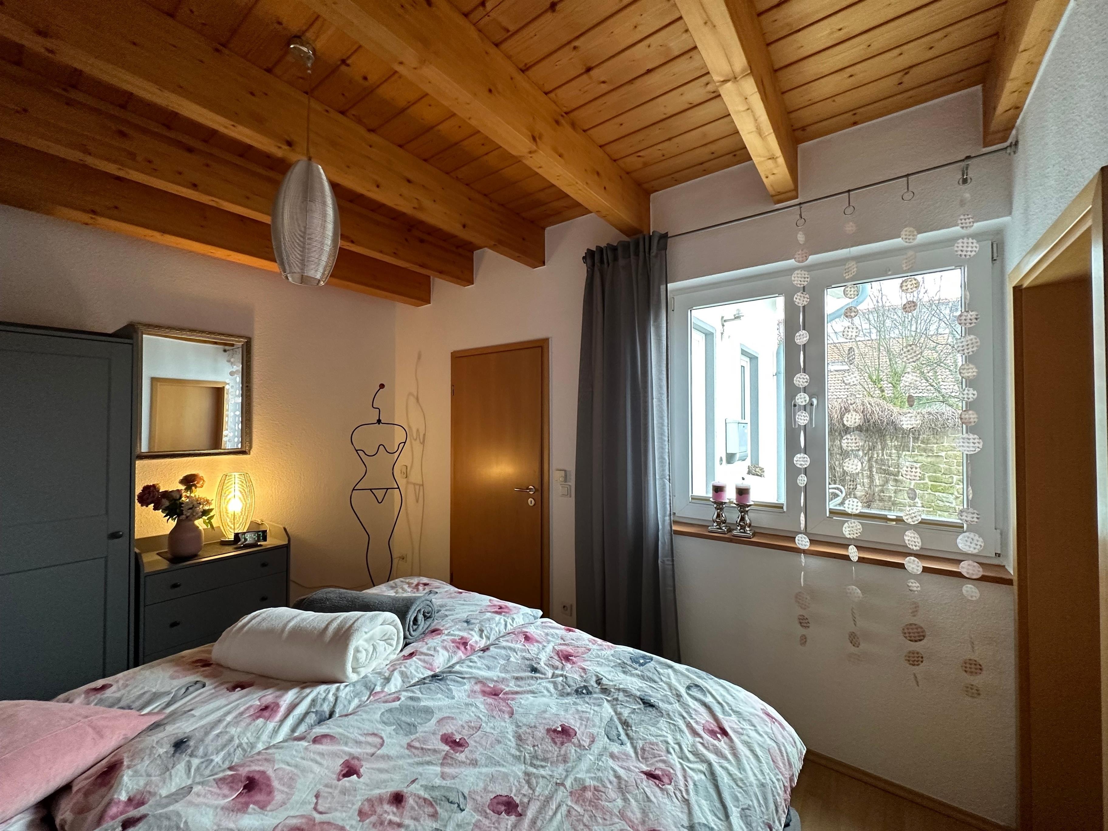 Es gibt ein Schlafzimmer, das über ein 180x200 cm großes, bequemes Boxspringbett, einen Kleiderschrank sowie eine Kommode verfügt.