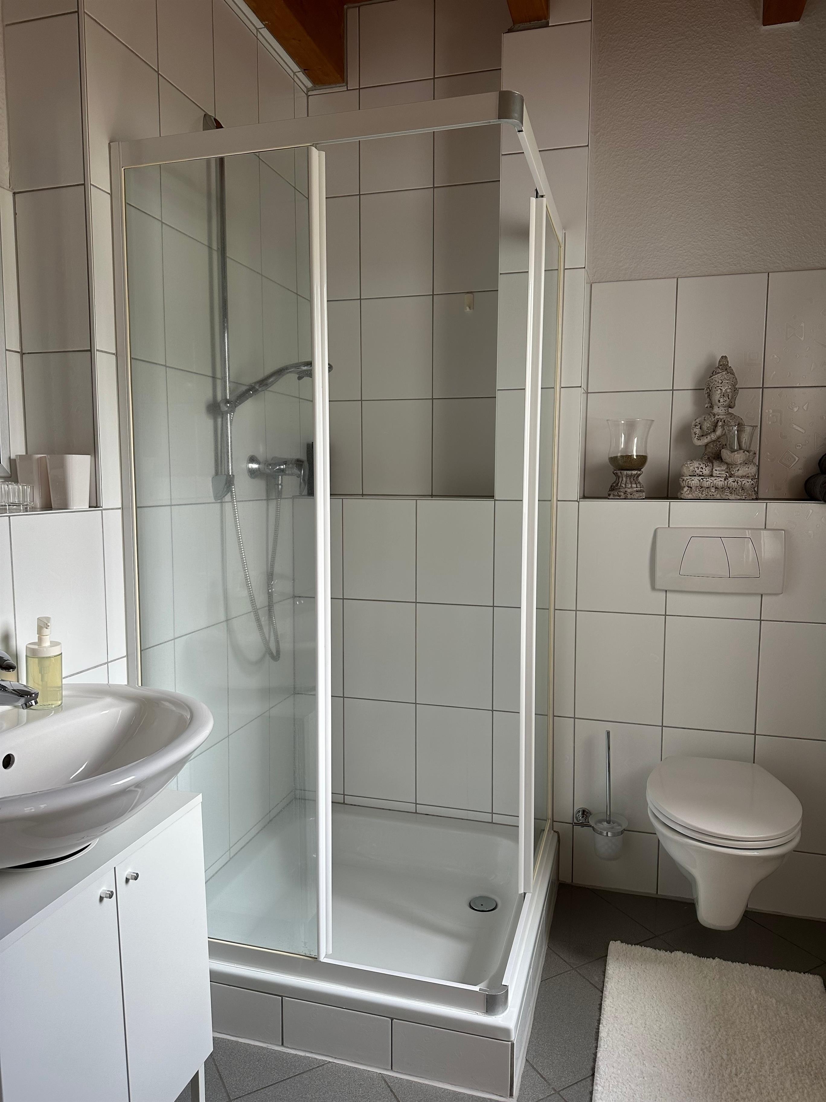 Das Badezimmer verfügt über eine Dusche, WC und ein Waschbecken.