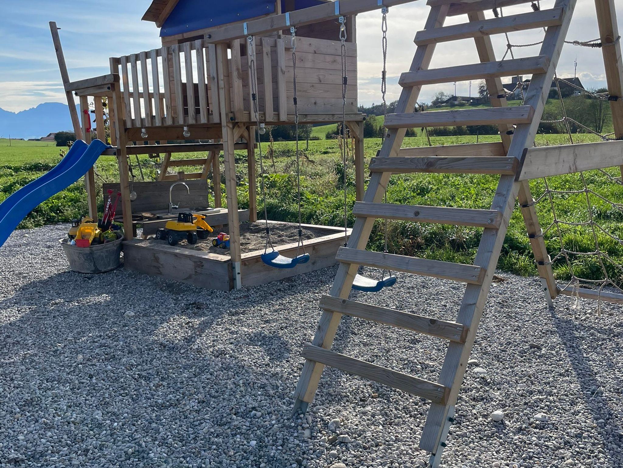 Es erwartet Sie eine sehr helle und freundliche Ferienwohnung 75 m2 mit eigenem Eingang und kostenlosen Parkplätzen vor dem Haus. Eine Wohnküche mit Sitzgruppe und TV, zwei Schlafzimmer mit einem Doppelbett und drei Einzelbetten. Beide Schlafzimmer haben einen Balkon mit herrlichen Ausblick in die Berge. Handtücher und Bettwäsche sind selbstverständlich vorhanden. Unser Badezimmer wurde im Winter 2022 erneuert mit WC und Dusche. Auch das WLAN haben wir mitte 2023 verbessert. Natürlich haben wir für die Kleinen vorgesorgt, es stehen Hochstuhl und Gitterbetten zur Verfügung.