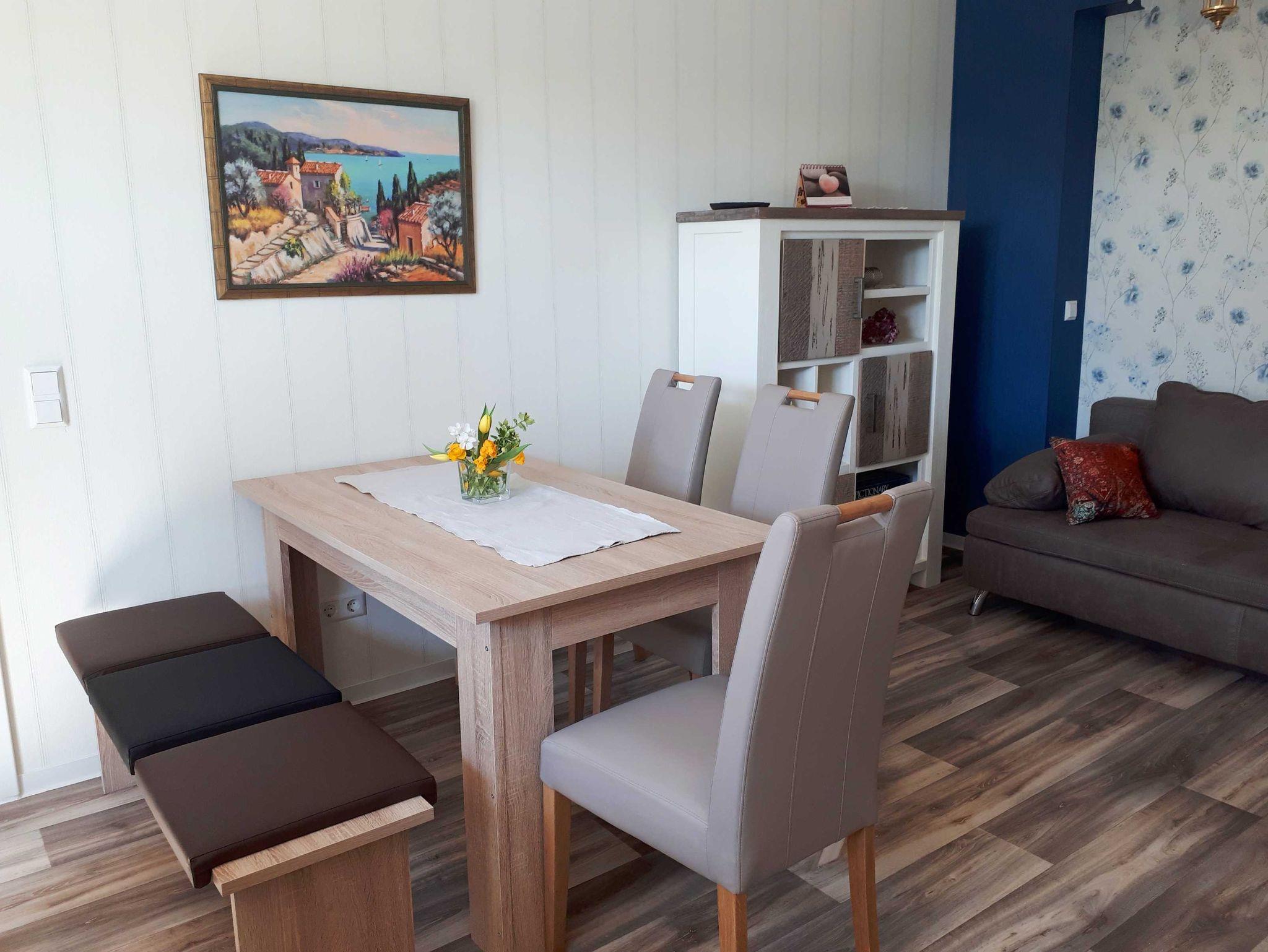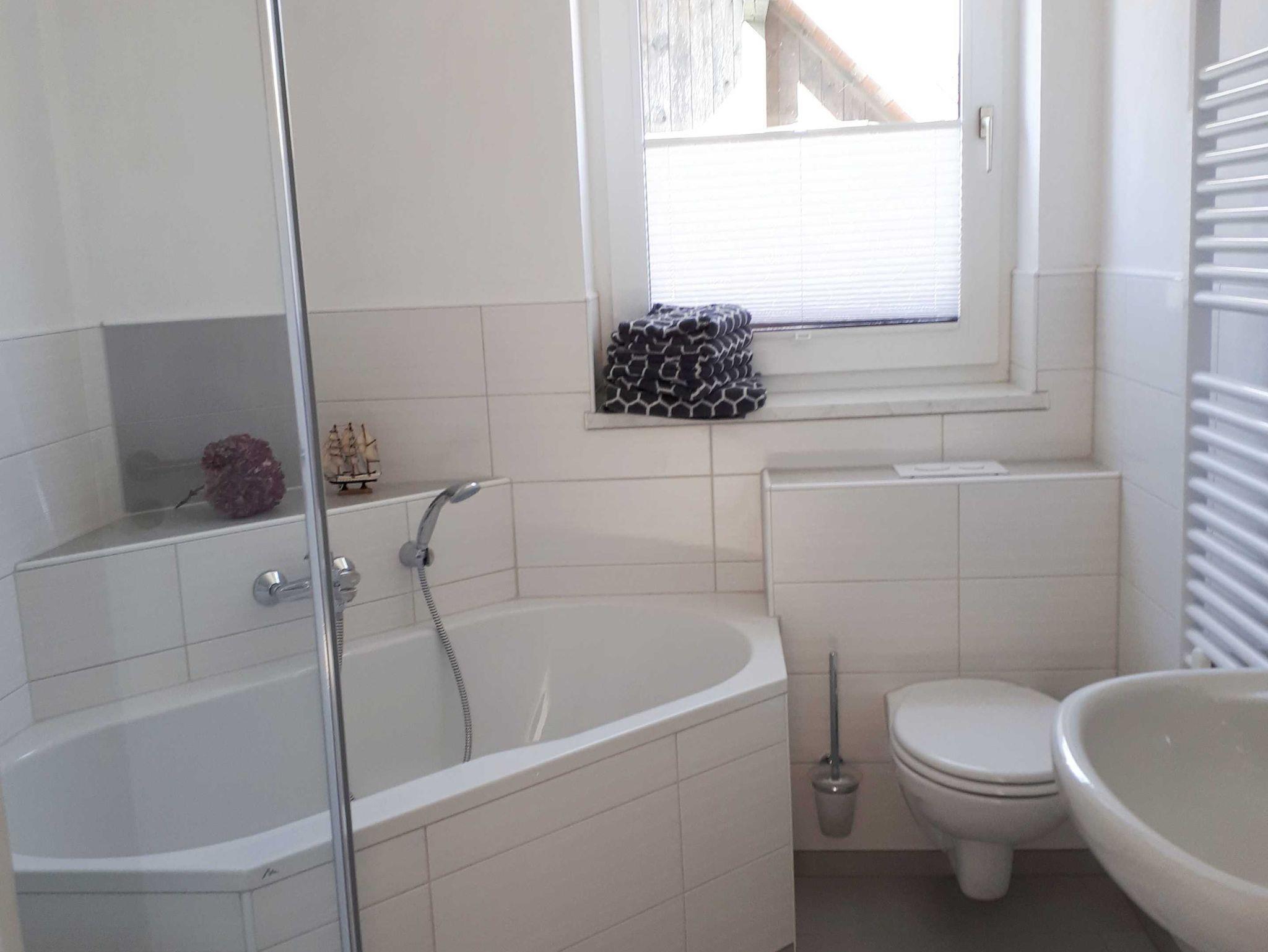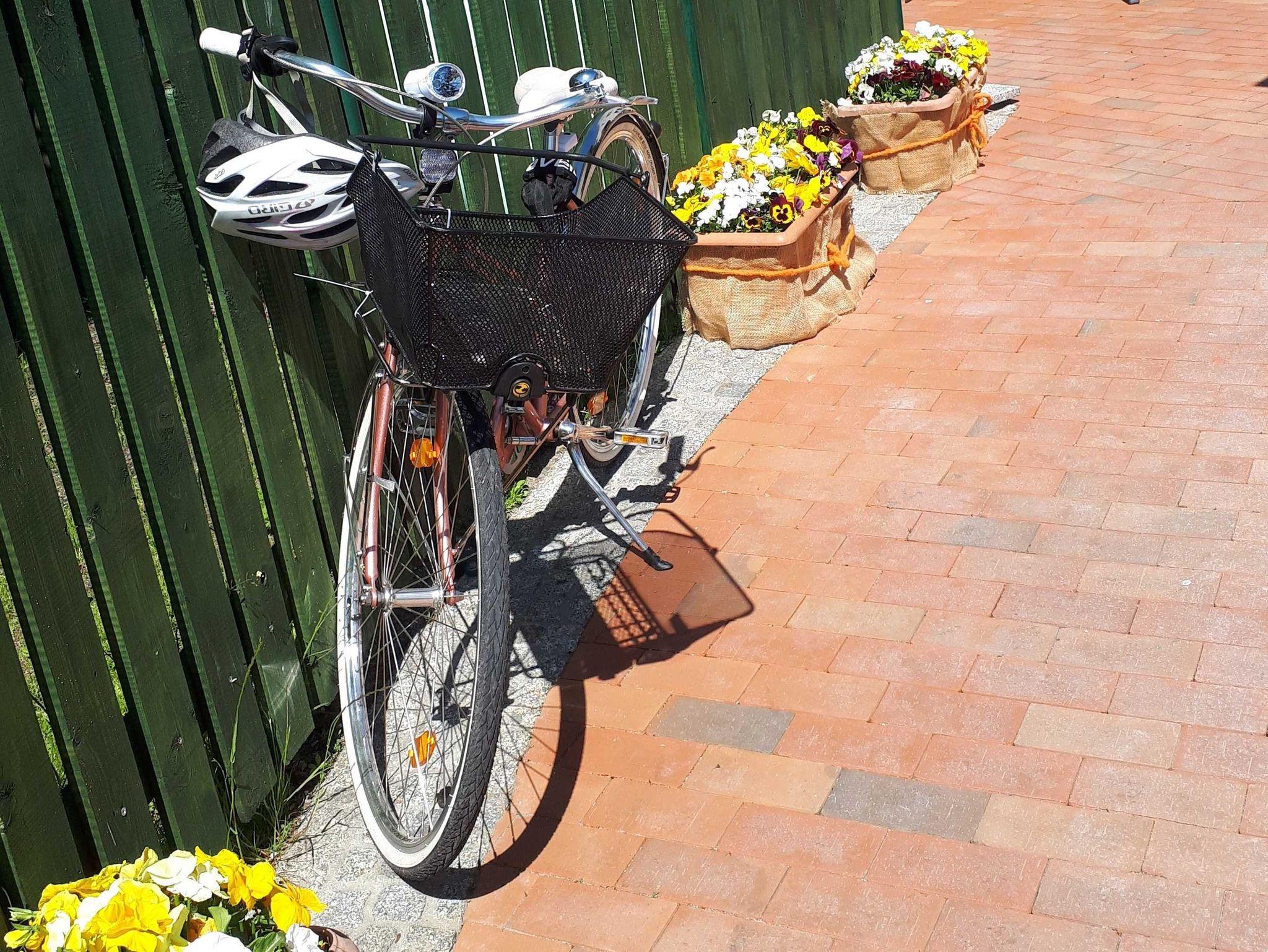 Die fahrradfreundliche Ferienwohnung Charlotte ist eine helle Ferienwohnung mit einem Schlafzimmer mit Doppelbett (und einem Kinderbett), einem kombinierten Wohn-Schlafraum mit Schlafsofa sowie einer Küche. Das Badezimmer ist mit Wanne ausgestattet.