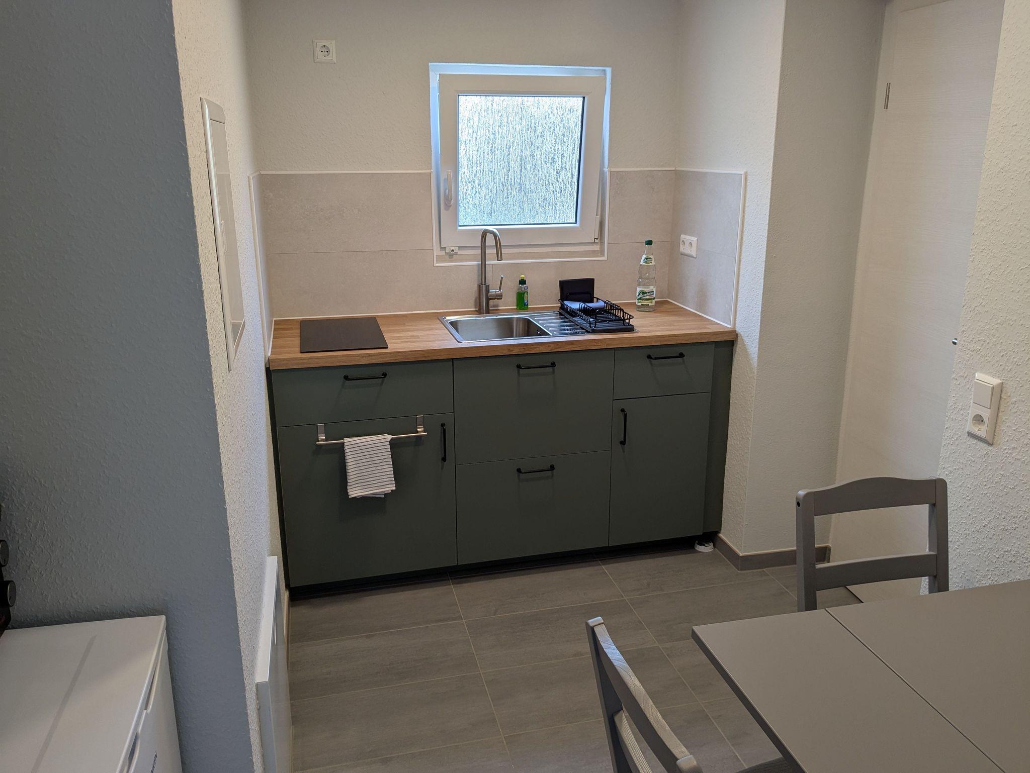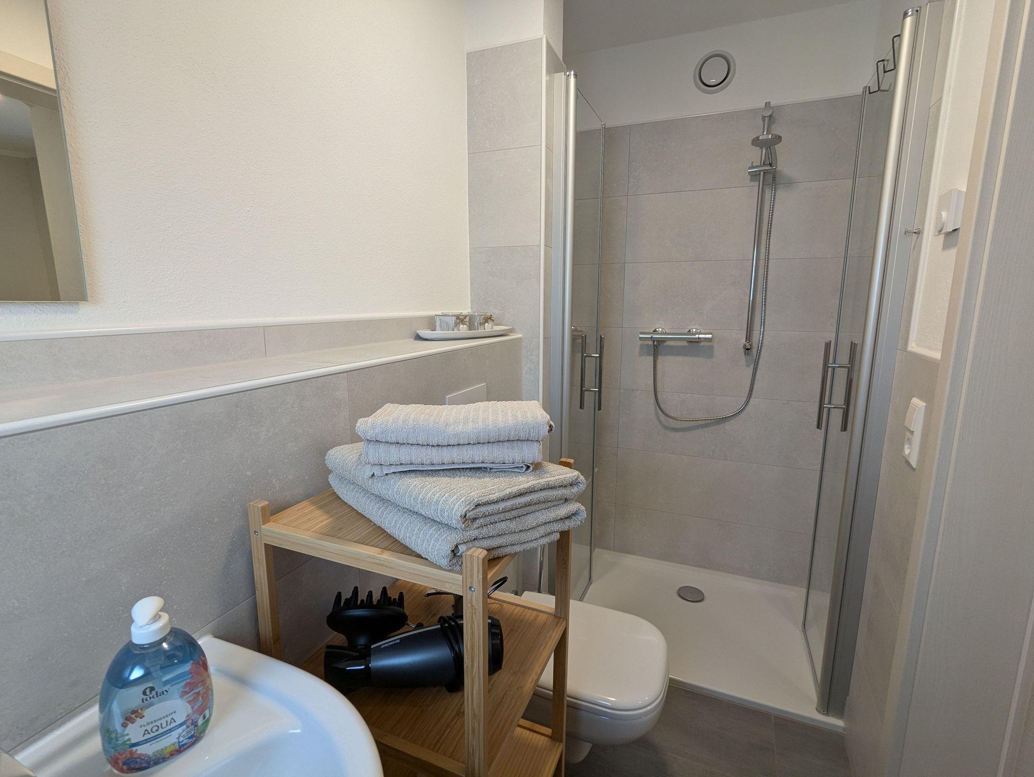 Dier Ferienwohnung verfügt über ein Schlafzimmer mit Arbeitsplatz und TV, eine separate voll ausgestattete Küche und ein Badezimmer mit ebenerdiger Dusche.