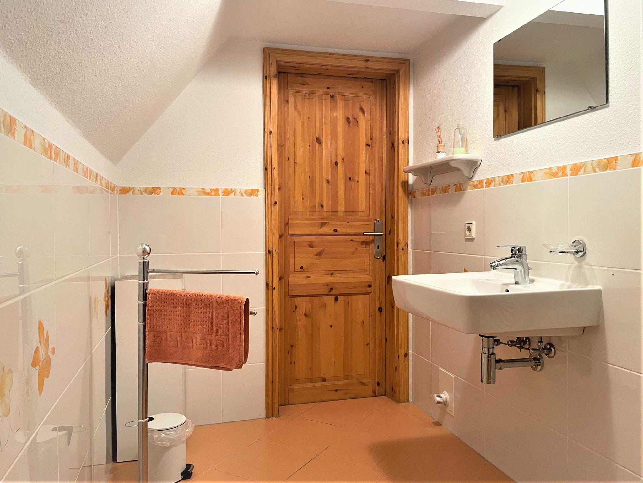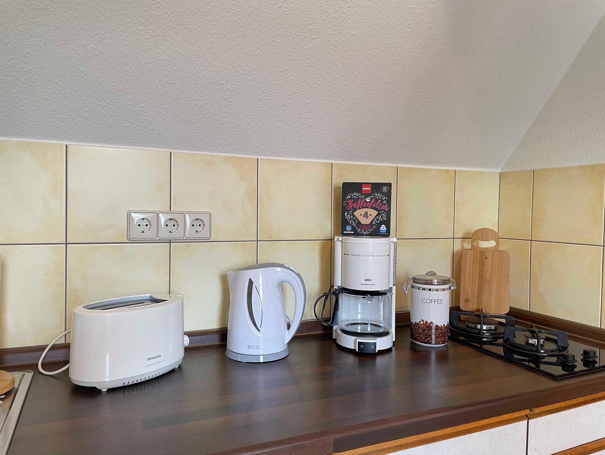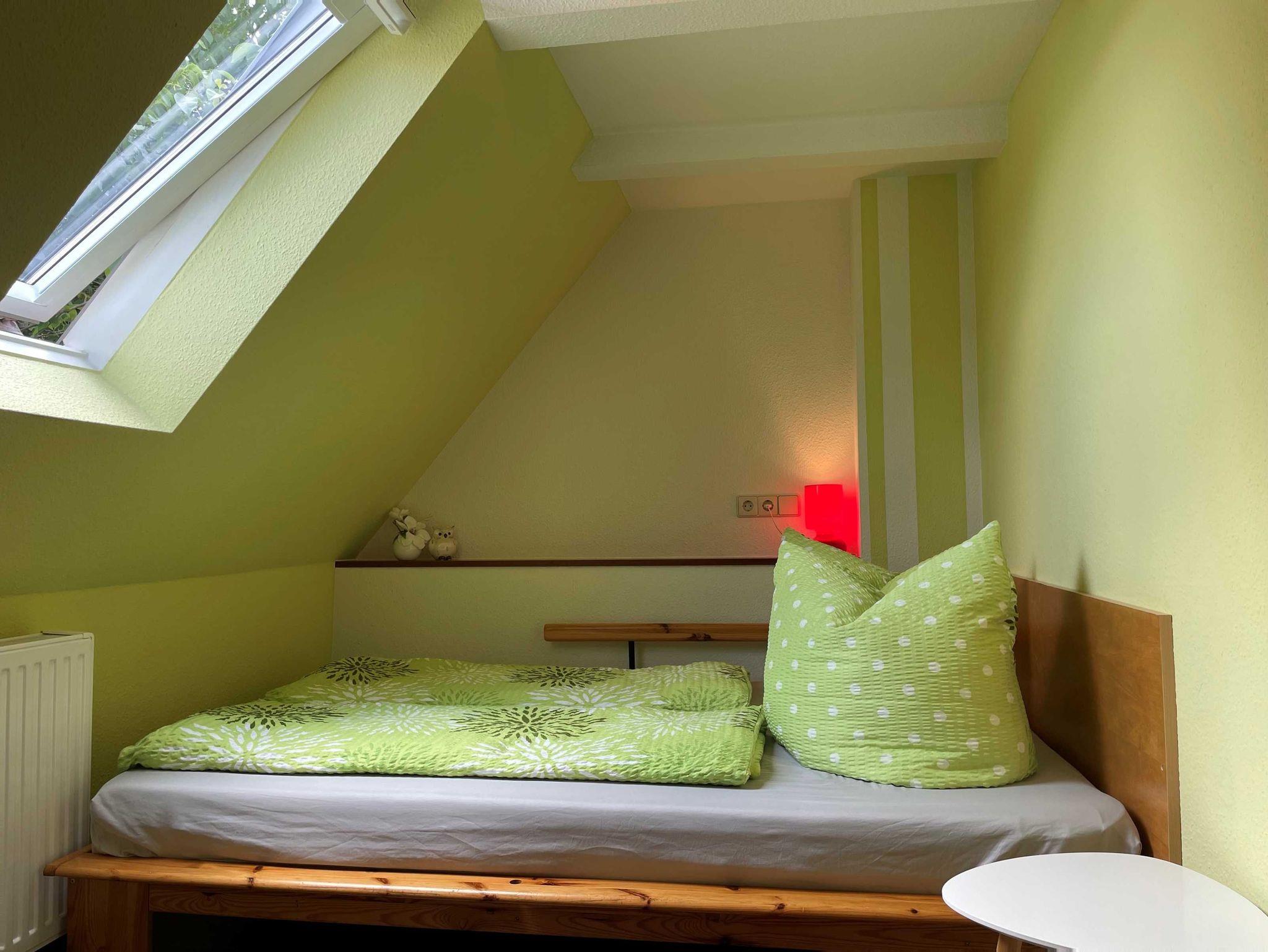 Über eine Treppe erreichen Gäste die im ausgebauten Dachgeschoss liegende Ferienwohnung. Ausgestattet ist das Wohnzimmer mit einem Sofa, welches auch für 2 weitere Person als Aufbettung dient. Weiterhin gibt es einen TV-Flachbildschirm und ein Radio zur Unterhaltung. Alle Fenster verfügen über einen Insektenschutz.. Das kleine Schlafzimmer besitzt ein Doppelbett. Der Einstieg ins Bett ist nur von einer Seite möglich. Eine schlichte Pantry Küche, ausgestattet mit Kaffeemaschine, Toaster, Gasherd (2 Kochstellen) sowie Wasserkocher stehen zur Verfügung. Im Bad finden Gäste eine Dusche und WC vor. Handtücher stehen nicht zur Verfügung.