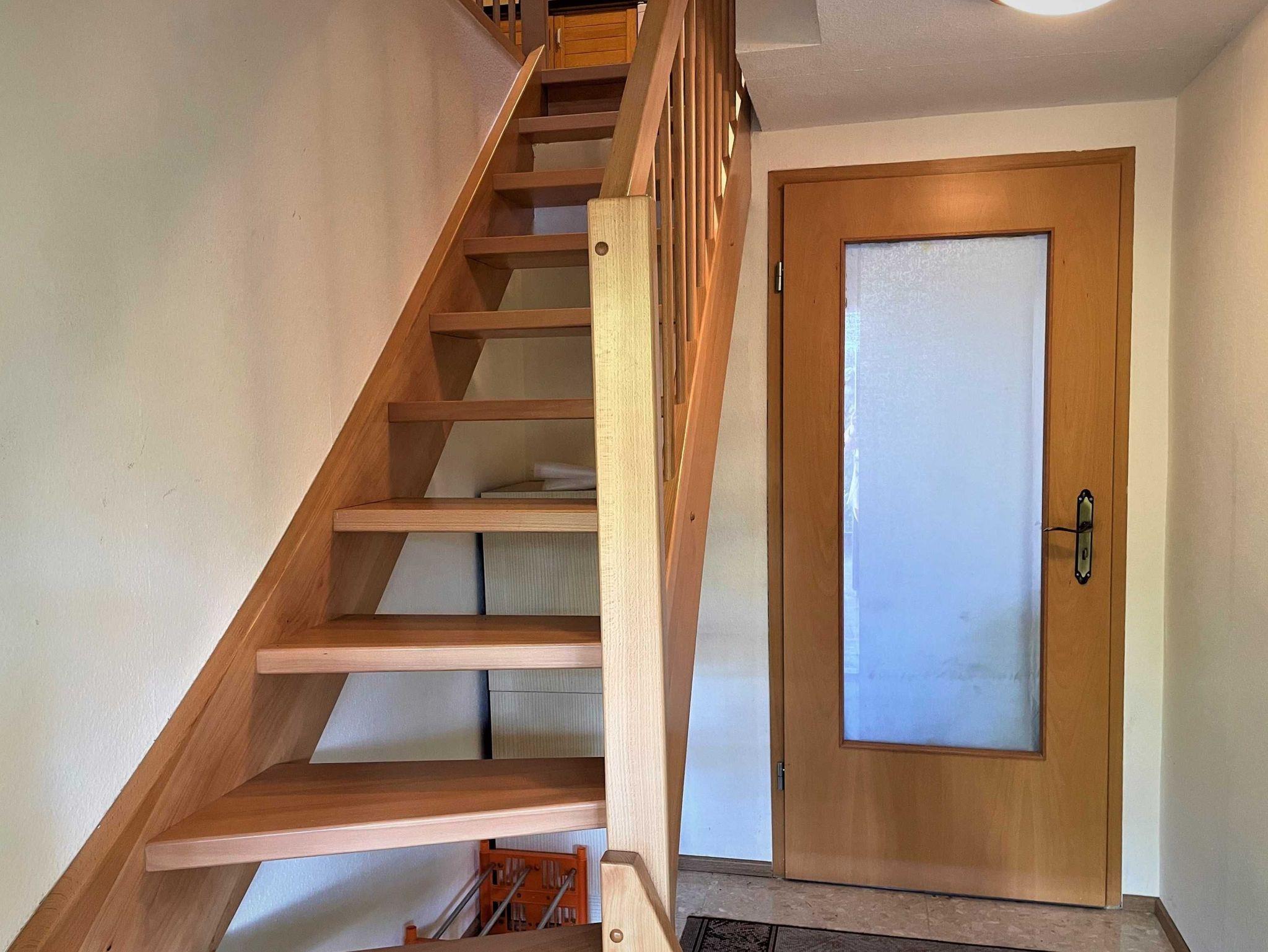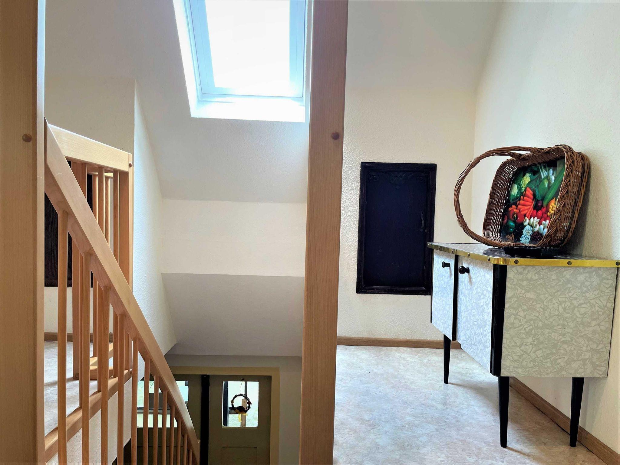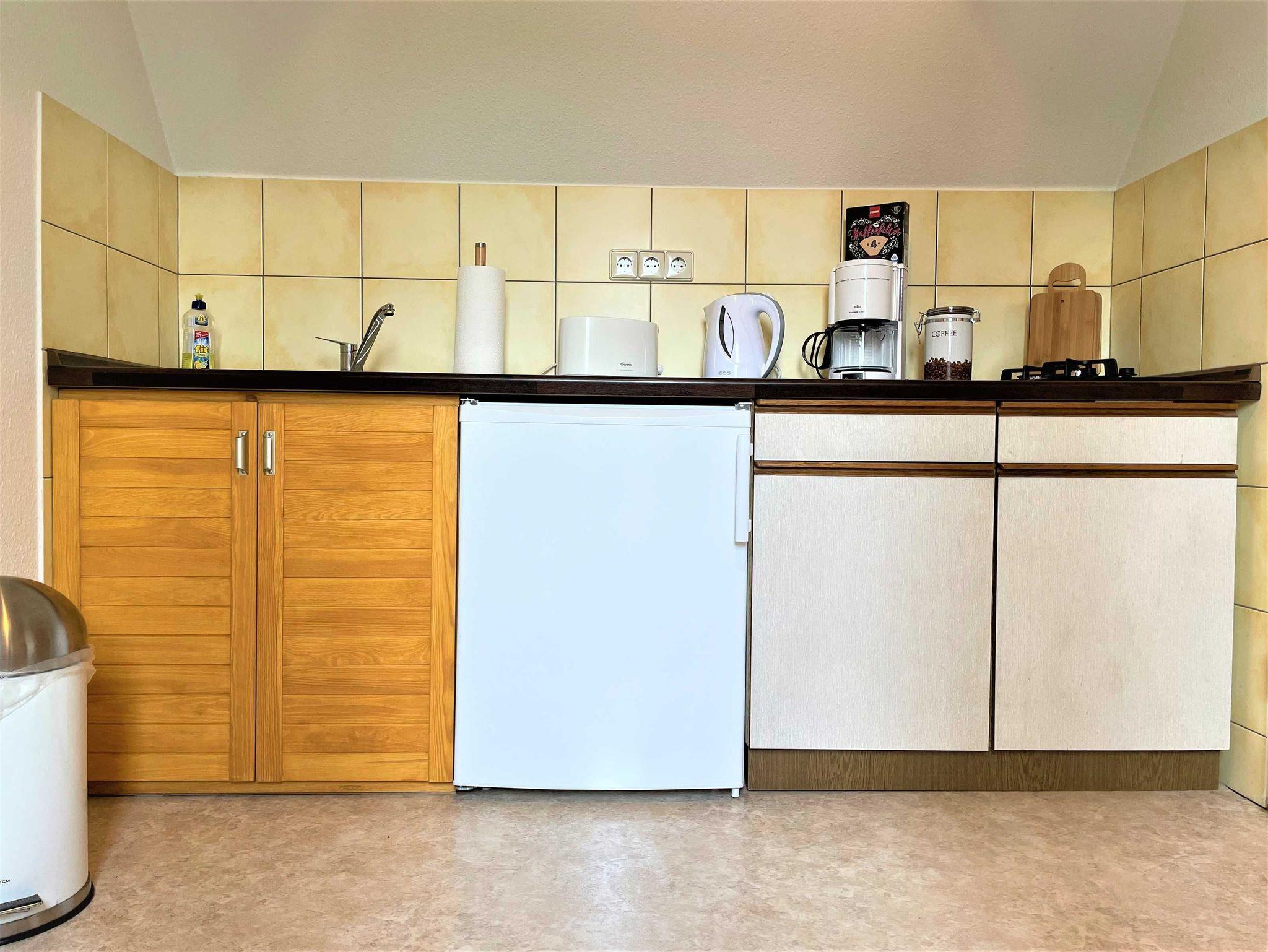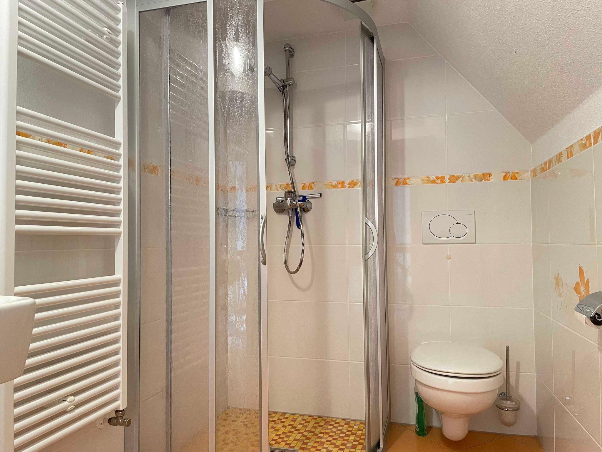 Über eine Treppe erreichen Gäste die im ausgebauten Dachgeschoss liegende Ferienwohnung. Ausgestattet ist das Wohnzimmer mit einem Sofa, welches auch für 2 weitere Person als Aufbettung dient. Weiterhin gibt es einen TV-Flachbildschirm und ein Radio zur Unterhaltung. Alle Fenster verfügen über einen Insektenschutz.. Das kleine Schlafzimmer besitzt ein Doppelbett. Der Einstieg ins Bett ist nur von einer Seite möglich. Eine schlichte Pantry Küche, ausgestattet mit Kaffeemaschine, Toaster, Gasherd (2 Kochstellen) sowie Wasserkocher stehen zur Verfügung. Im Bad finden Gäste eine Dusche und WC vor. Handtücher stehen nicht zur Verfügung.