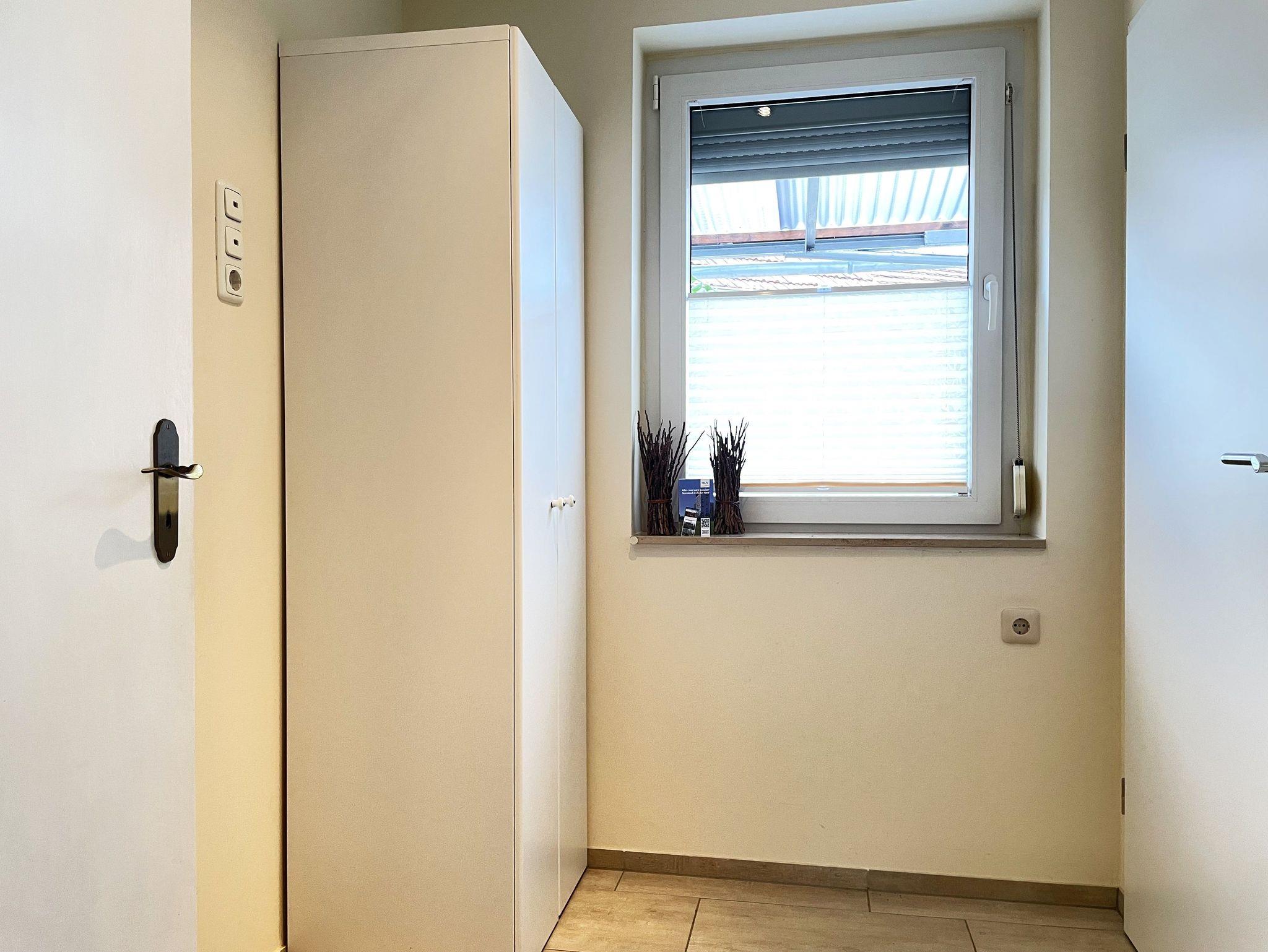 Das moderne Bad ist mit einer Dusche, einem Waschbecken, WC und einem Handtuchwärmer ausgestattet. Ein kleiner Flur mit Garderobenschrank bietet zusätzlichen Stauraum und rundet das wohnliche Gesamtbild ab.