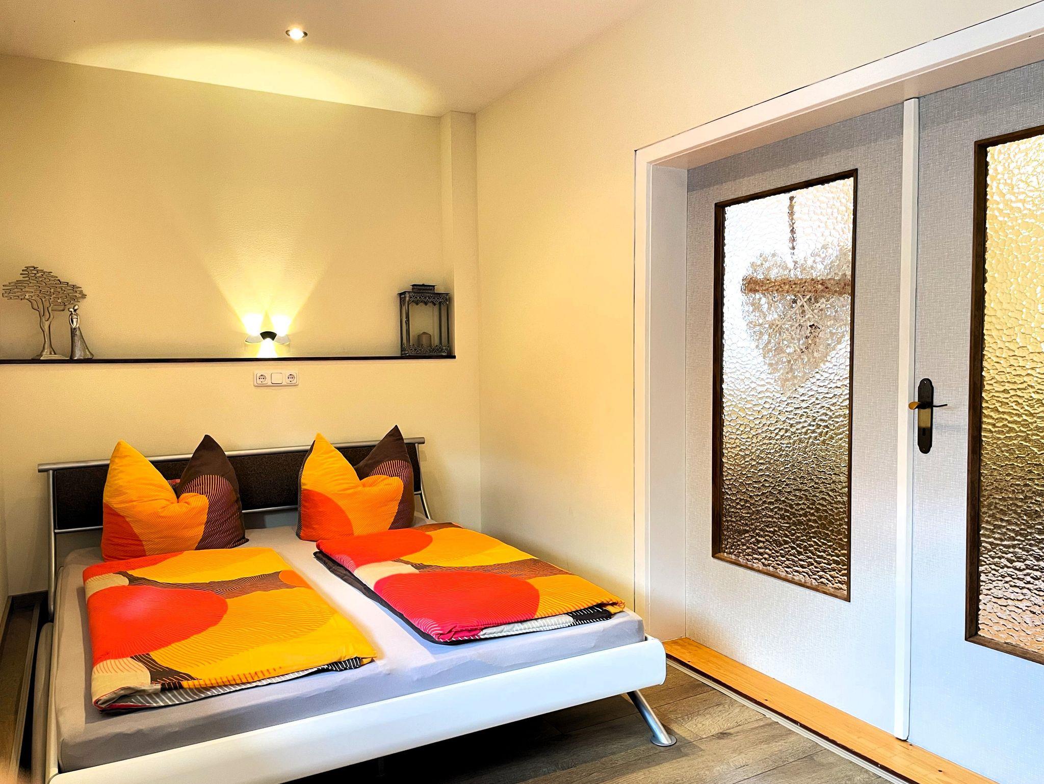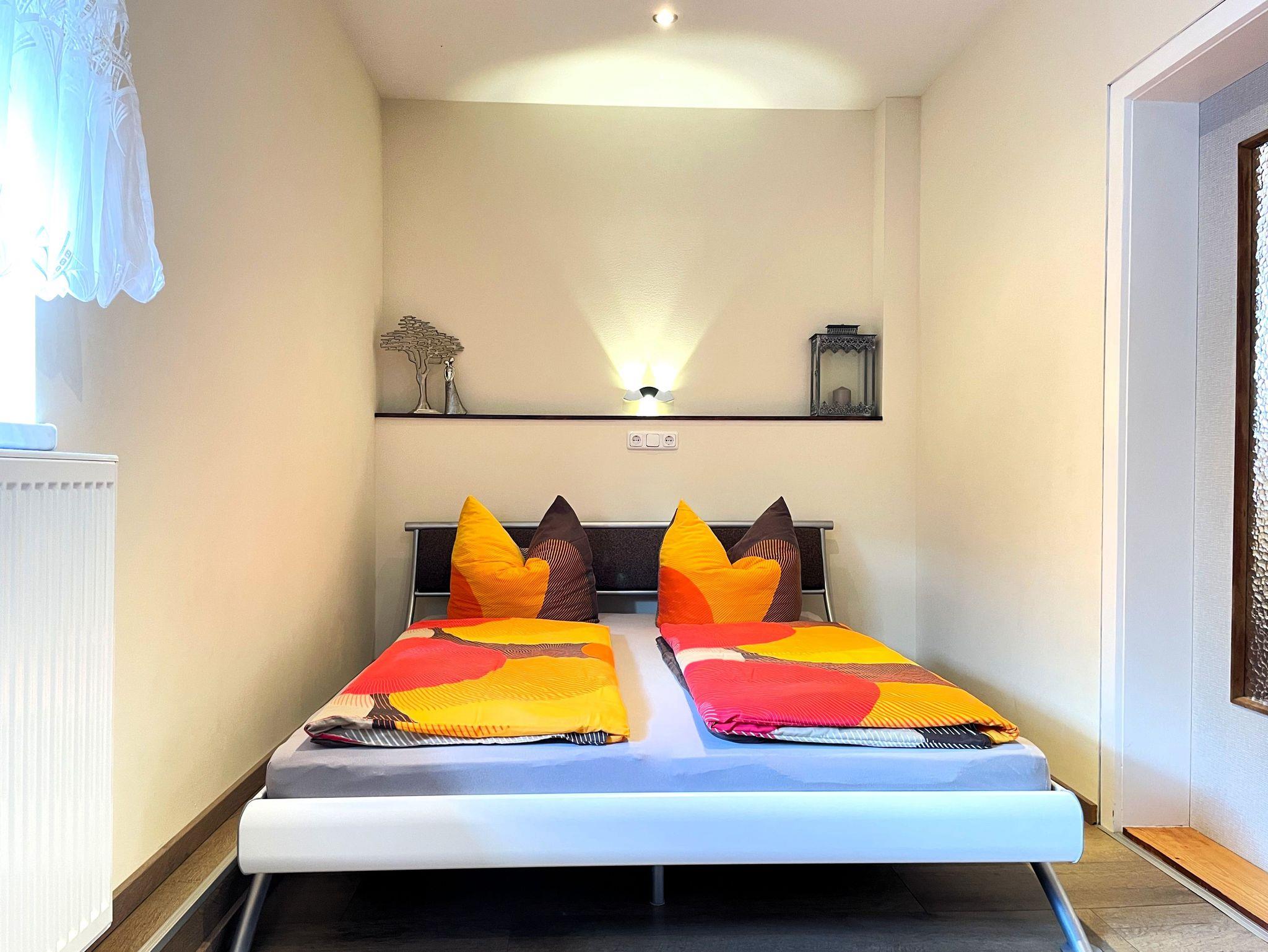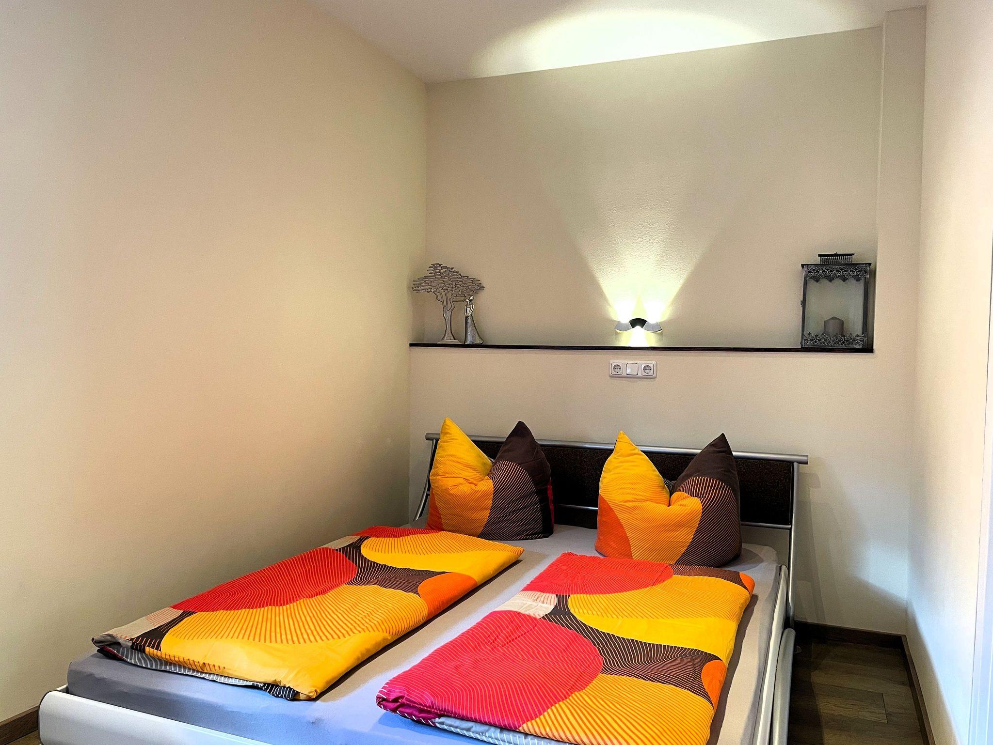 Im separaten Schlafzimmer erwartet Sie ein bequemes Doppelbett (1,60 m x 2,00 m), das mit freundlichen Farben und warmem Licht für eine angenehme Atmosphäre sorgt.