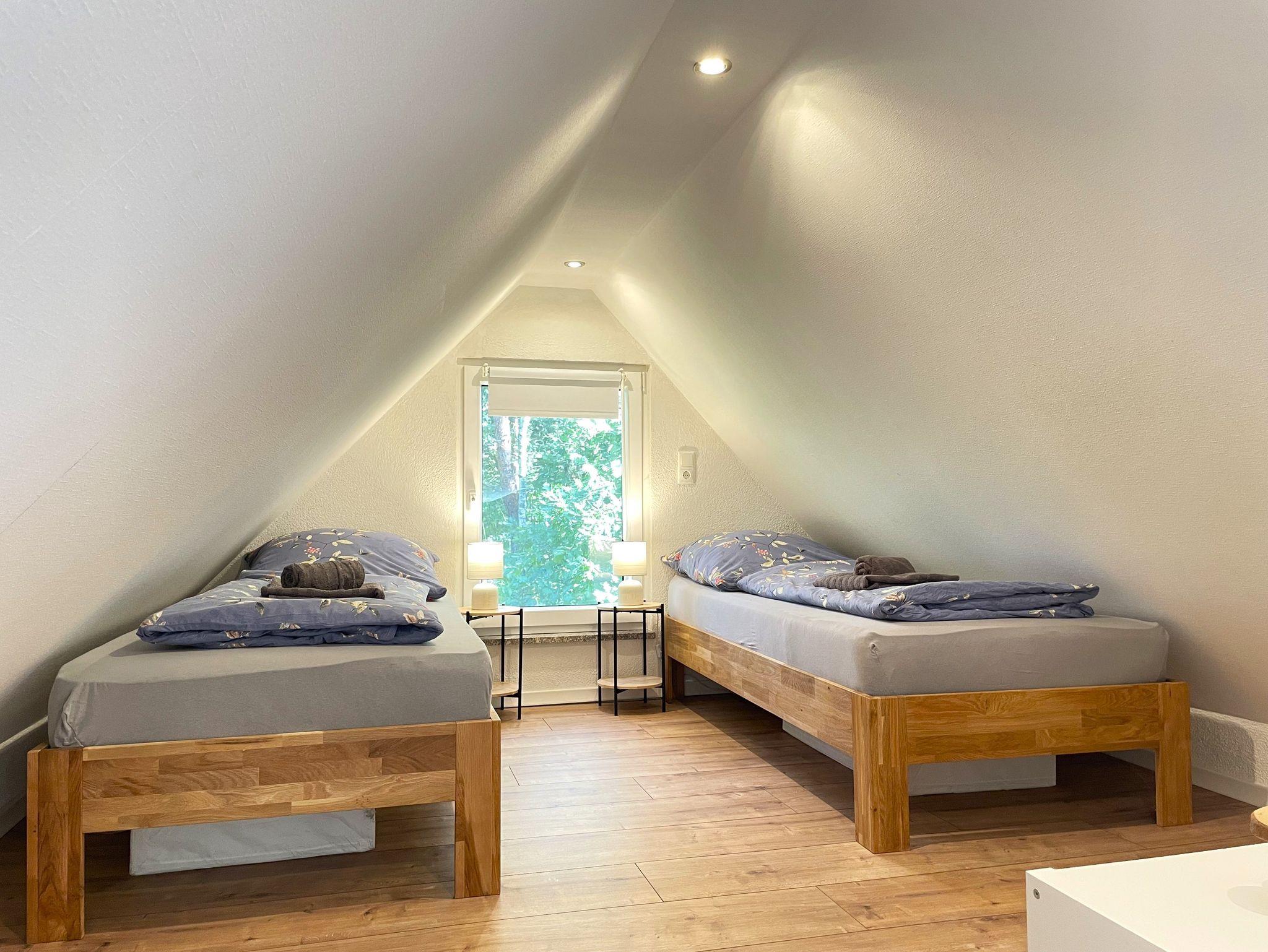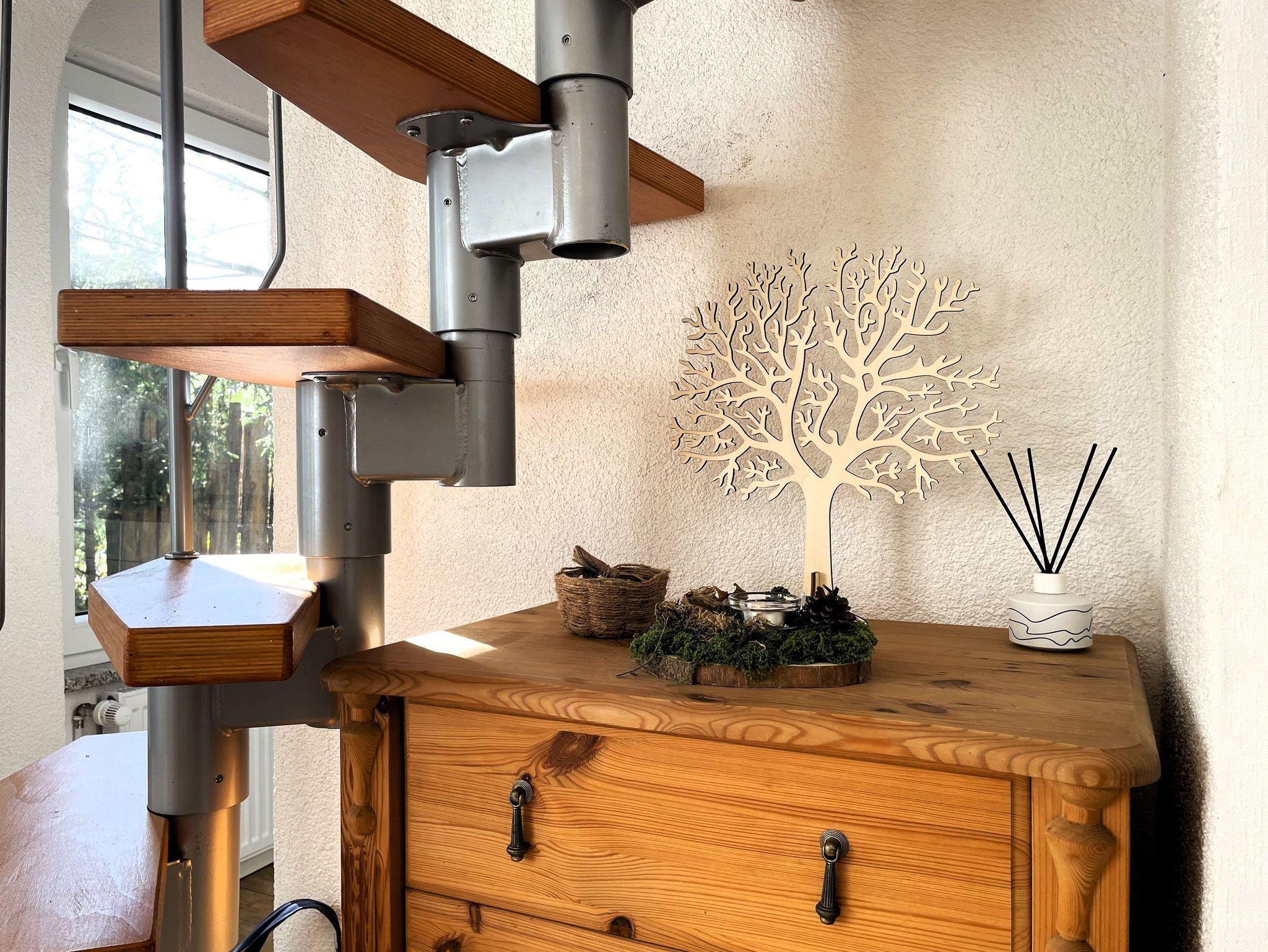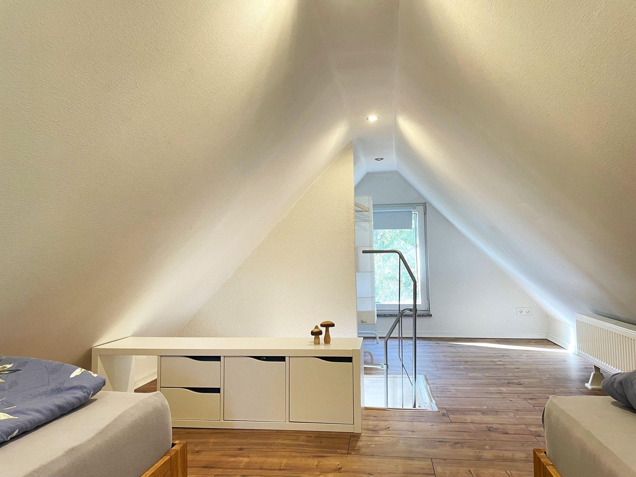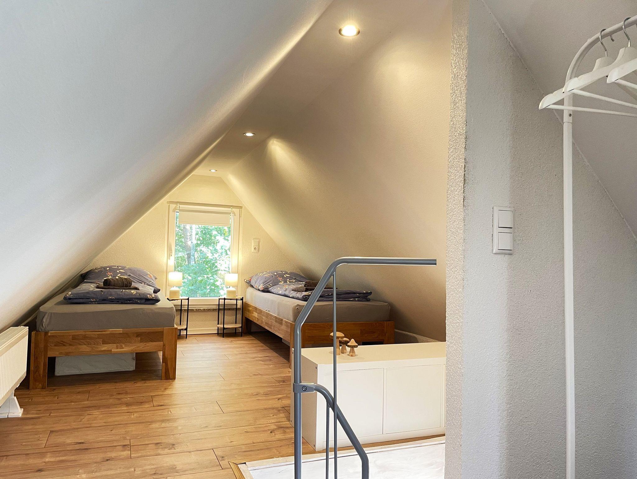 Willkommen im Fuchsbau einem kleinen Rückzugsort am Waldrand, ideal für zwei Personen und auch mit einem Kleinkind bis 3 Jahre geeignet. Im Erdgeschoss lädt ein gemütliches Wohnzimmer mit Ecksofa, Esstisch, Smart-TV und knisterndem Kaminfeuer zum Entspannen ein. Gleich daneben befindet sich die offene Küche, ausgestattet mit allem, was man für eine genussvolle Auszeit braucht vom Backofen über Kühlschrank mit Gefrierfach bis hin zu Kaffeemaschine, Toaster und Wasserkocher. Das kleine Bad mit Dusche, WC und Waschtisch liegt direkt angrenzend. Über eine Wendeltreppe geht es ins Dachgeschoss, wo zwei getrennt stehende Betten auf Sie warten.