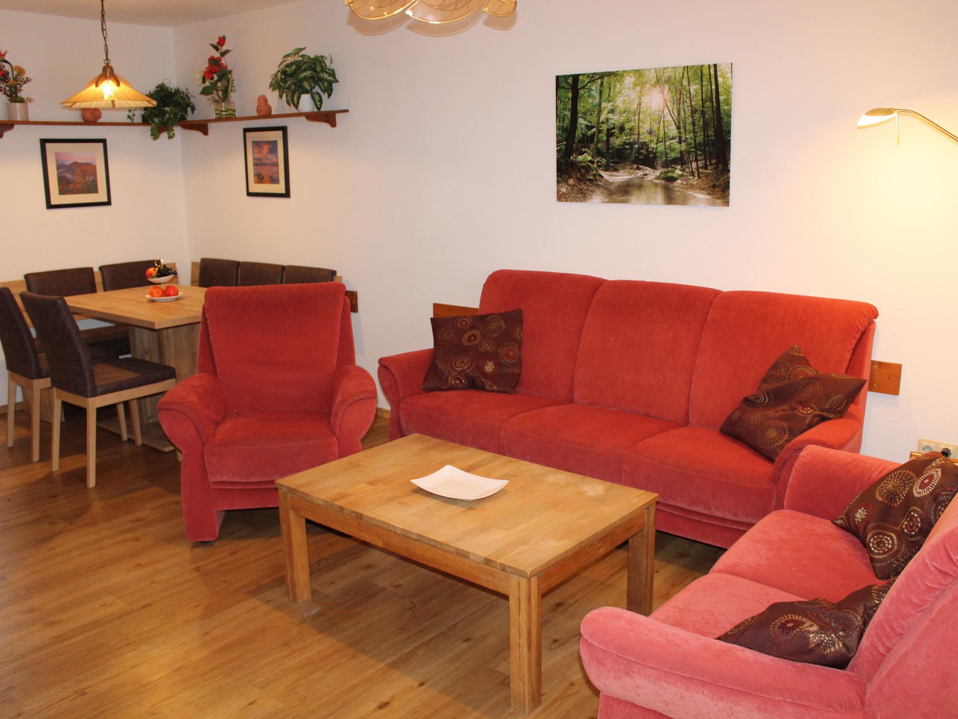 Unser liebevoll eingerichtetes Wohnzimmer mit integrierter Eßecke ist ausgestattet mit einer neuen Sitzgruppe, bestehend aus einer 3-Sitzer und einer 2-Sitzer-Couch, sowie einem bequemen Einzelsessel, neuer Schrankwand mit Fernseher, CD-Radio und Telefon.