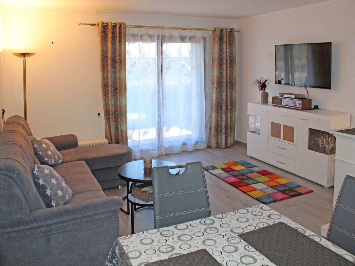 Voll möbliertes Wohnzimmer mit gemütlicher Sitzgarnitur. Flachbild-Fernseher und Radio gehören ebenfalls zur Ausstattung dieses Hauses. Vom Wohnzimmer aus gelangen Sie direkt auf Ihre Terrasse. Grillen mit Ihrem eigenen Grill ist gestattet. Der direkt angrenzende Essbereich bietet Platz für Ihre gemeinsamen Mahlzeiten und gemütliche Abende.