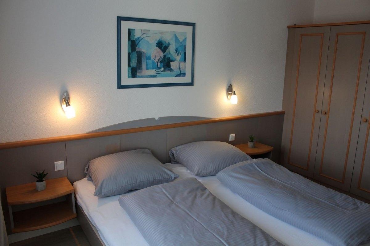 mit Doppelbett und geräumigem Kleiderschrank. Auch von diesem Zimmer aus haben Sie Zutritt zur Terrasse.