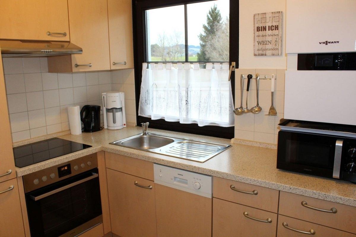 Ein komplett ausgestattete Küche mit Spülmaschine, E-Herd mit Backofen, Mikrowelle, Kaffeemaschine, Wasser- und Eierkocher, Toaster...