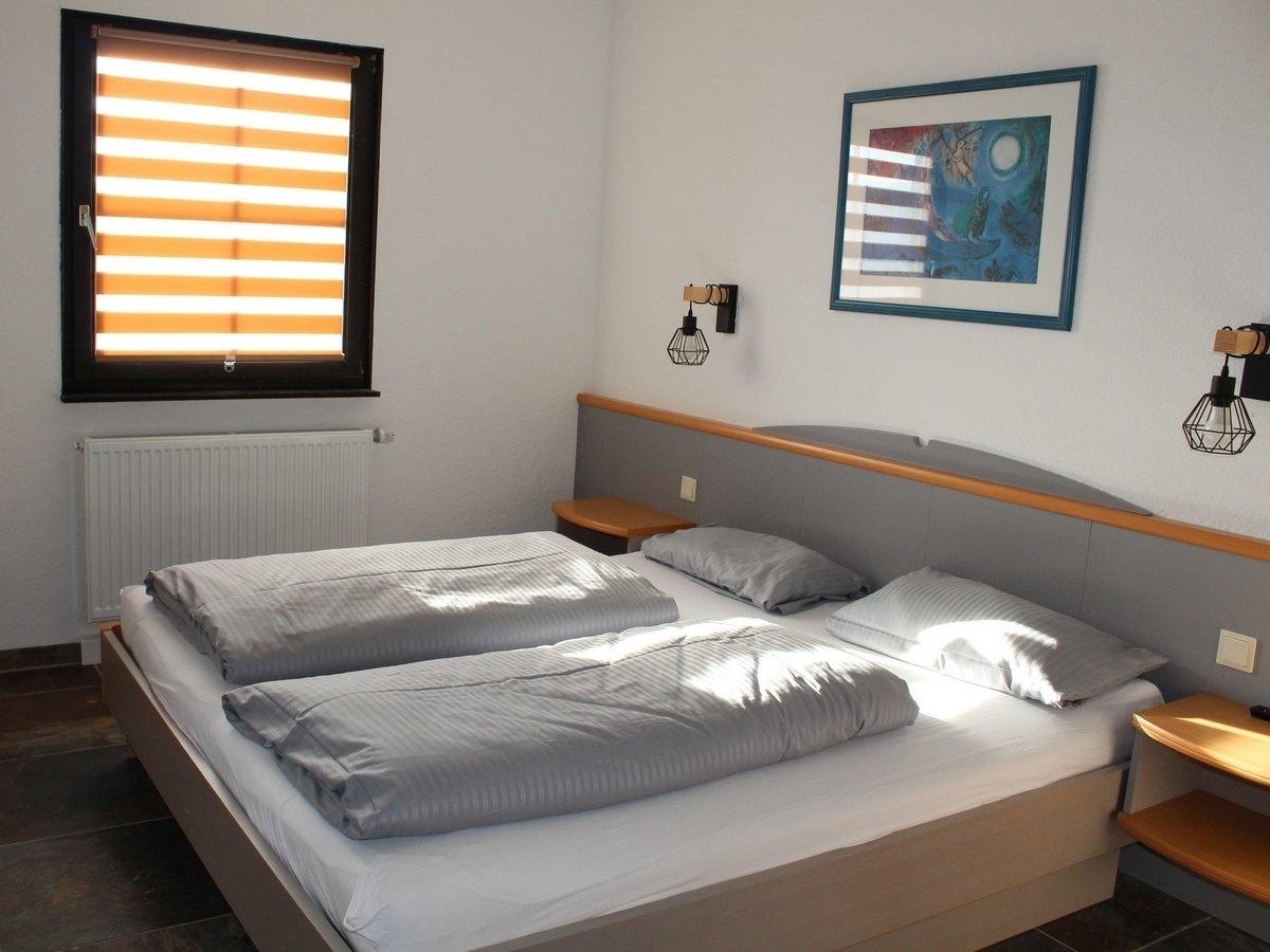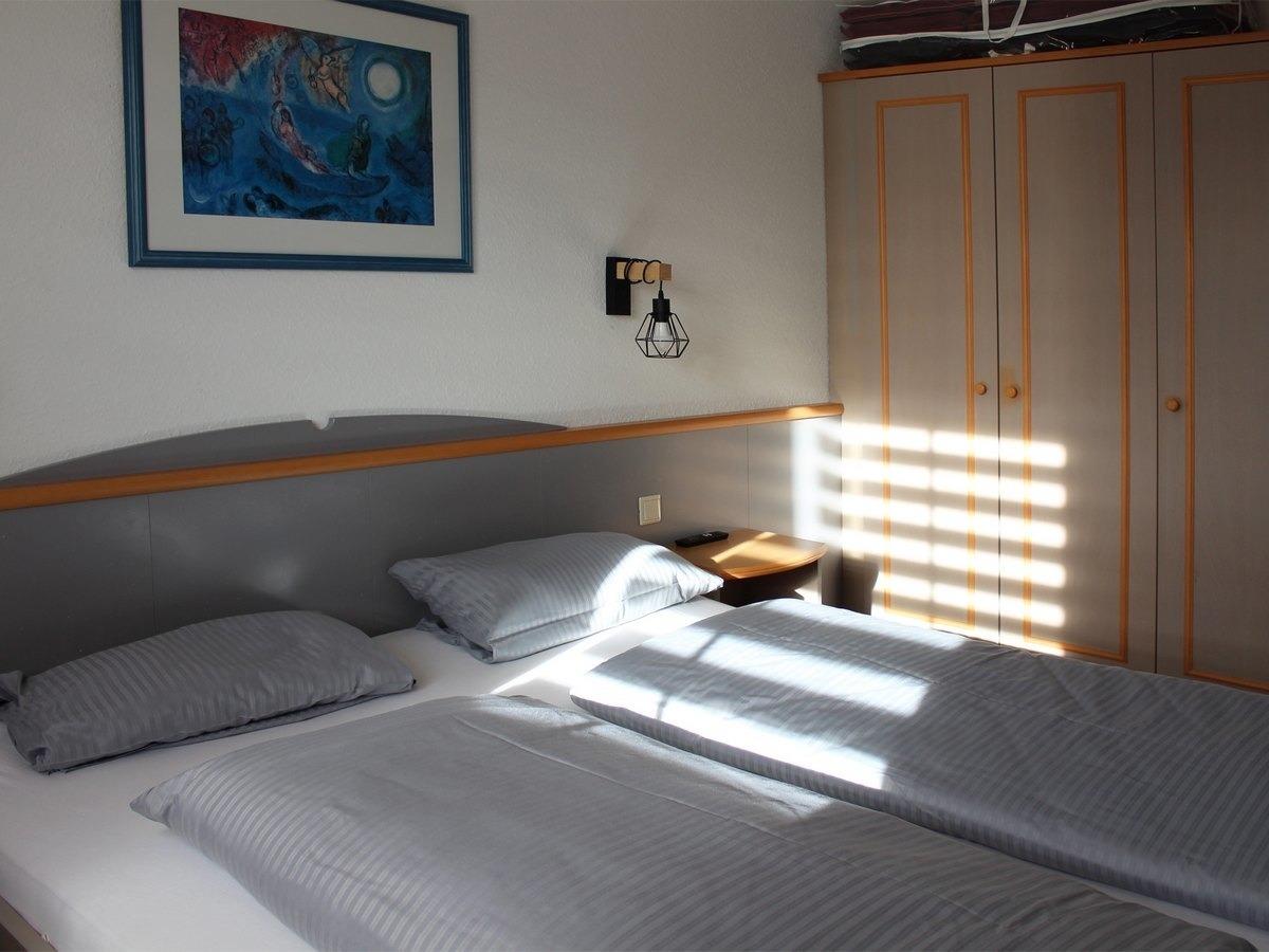 Doppelbett und geräumiger Kleiderschrank. Auch von diesem Zimmer aus haben Sie Zutritt zur Terrasse.