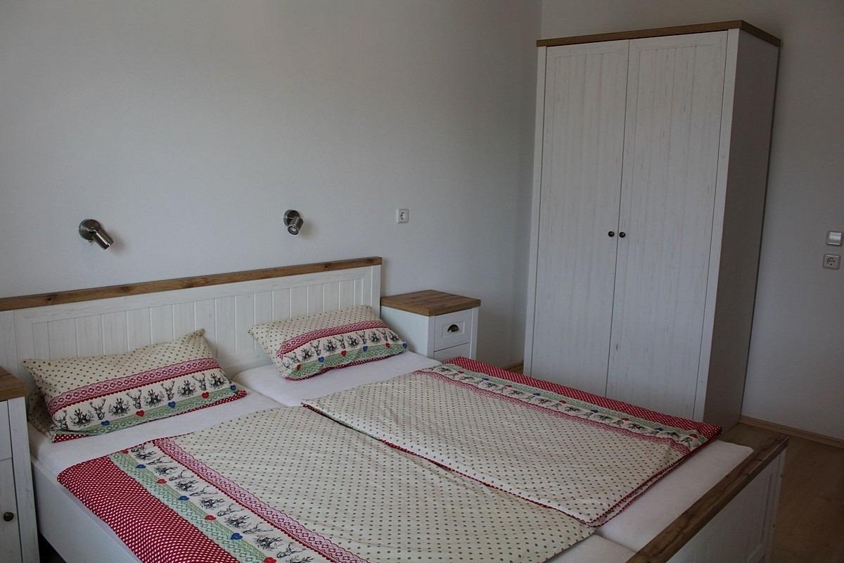 Großem Schlafzimmer, Doppelbett mit Nachttisch und Schrank mit direktem Zugang zur Terrasse