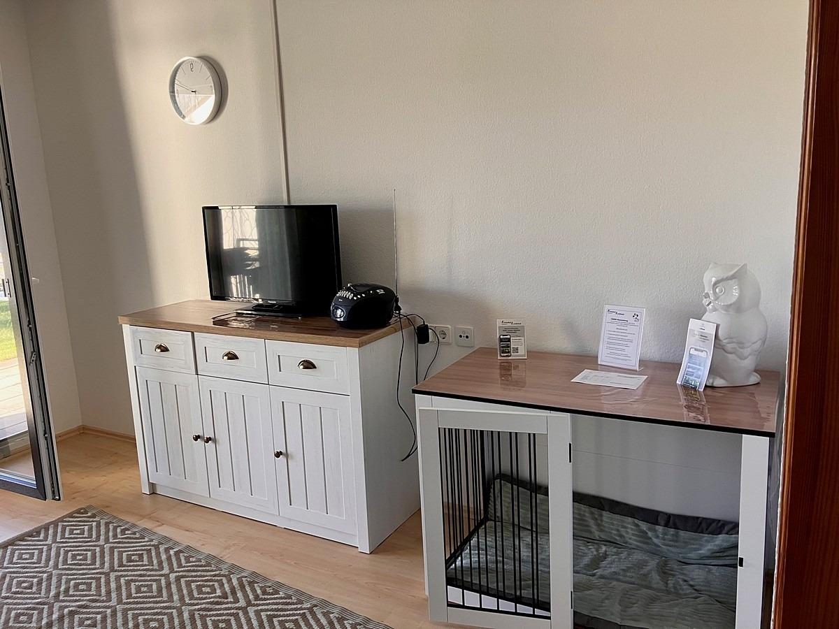 Es gibt eine feste Hundebox im Haus 100x60, Platz für eine weitere Hundebox ist vorhanden. Futterstation mit zwei Näpfen.