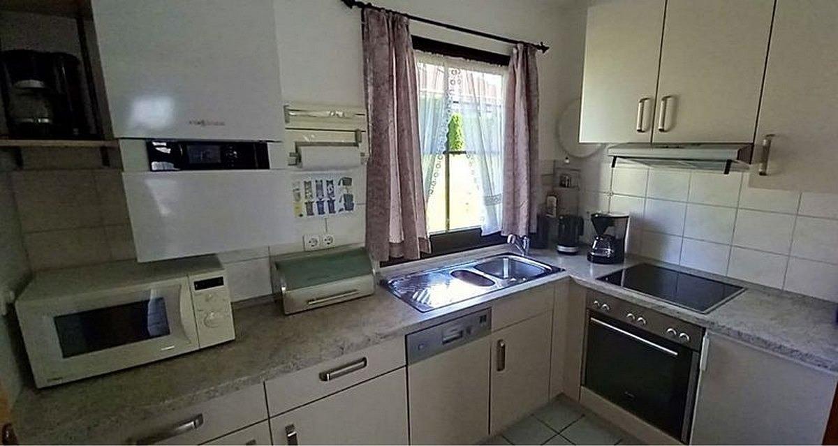 Voll ausgestattete Küche mit Spülmaschine, Elektroherd mit Ceran-Kochfeld und Backofen, Kühlschrank mit Eisfach, Kaffeemaschine, Wasserkocher, Mikrowelle, Toaster, ausreichend Koch- sowie Küchenzubehör.