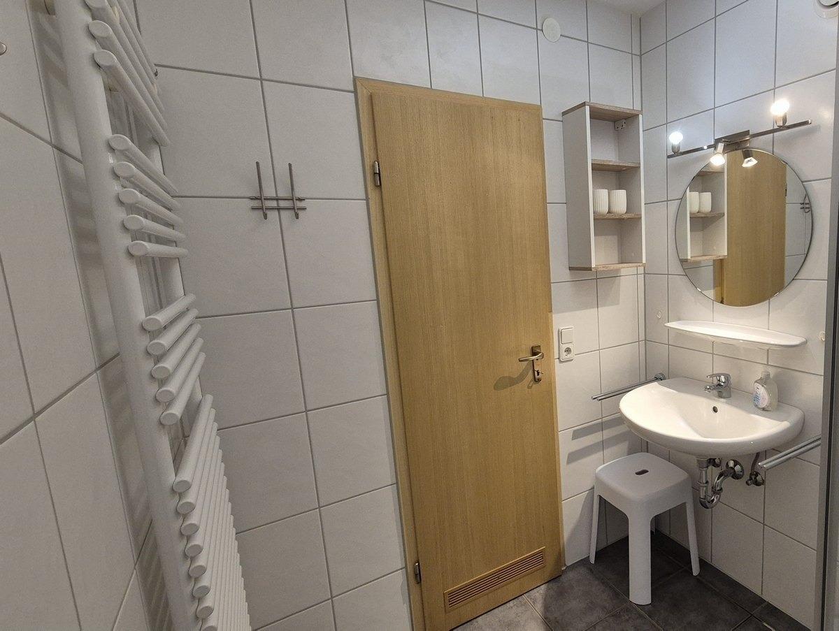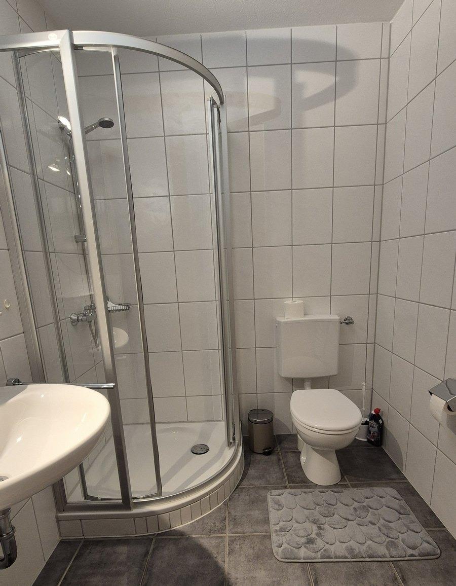 Bodenbeläge: In Flur, Küche und Bad, Wohnzimmer Steinzeug, in den übrigen Räumen Laminat