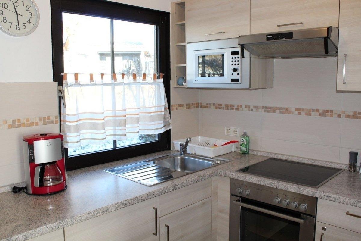 Voll ausgestattete Küche: Kühlschrank, Herd (Cerankochfeld) mit Dunstabzug, Backofen, Gefrierfach, Wasserkocher, Toaster, Kaffeemaschine, Besteck, Geschirr, Gläser, Töpfe und alle gebräuchlichen Küchenutensilien.