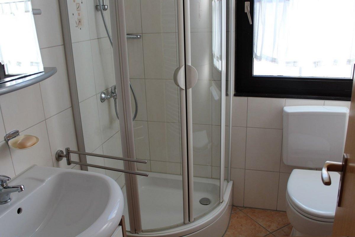 mit Tageslicht: Dusche, ein Waschbecken, Spiegel und WC.