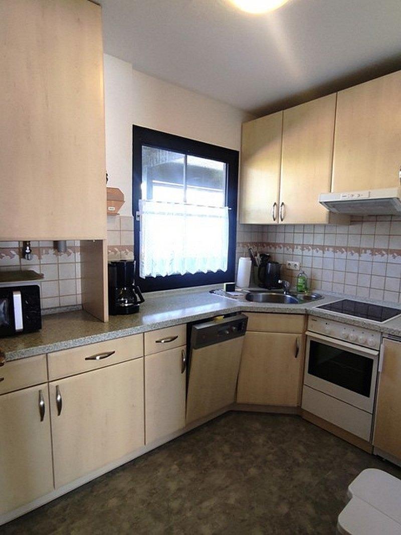 Voll ausgestattete Küche: Kühlschrank mit Gefrierfach, Herd (Ceranfeld), Dunstabzug, Geschirrspüler, Backofen, Wasserkocher, Toaster, Kaffeemaschine, Rührgerät, Besteck, Geschirr, Gläser, Töpfe und alle gebräuchlichen Küchenutensilien.